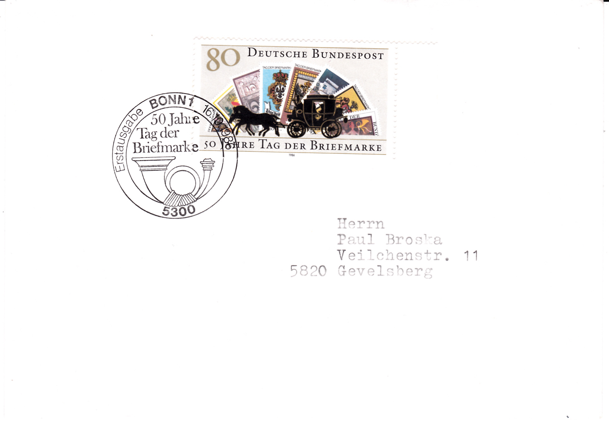 Gelaufener Brief vom Ersttag der Marke zum Tag der Briefmarke 1986 mit dem Ersttagsonderstempel Bonn.