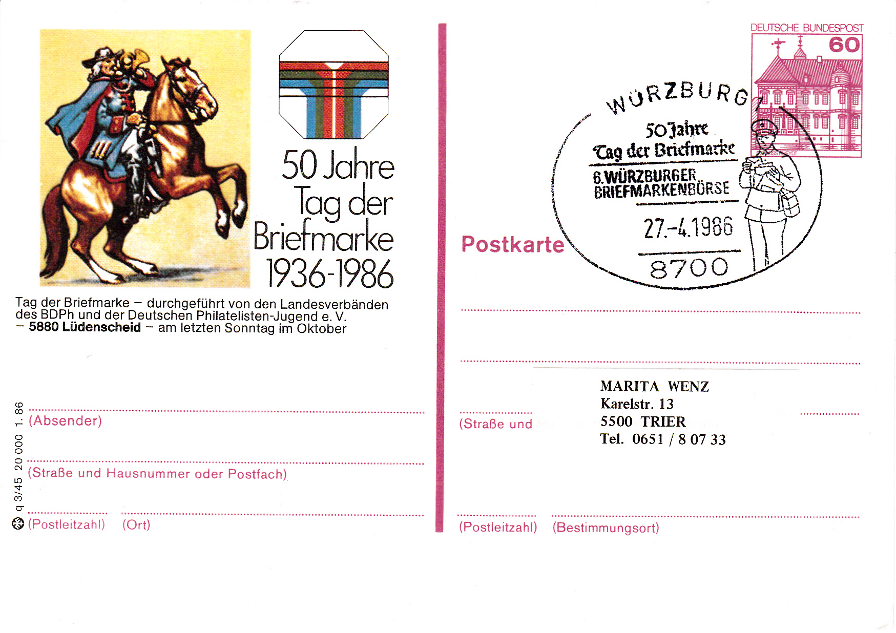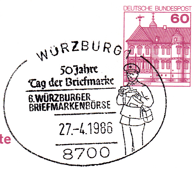 Sonderstempel vom 27.4.1986 aus Würzburg zum Thema "50 Jahre Tag der Briefmarke". Im Stempelbild wird ein Briefzusteller gezeigt.