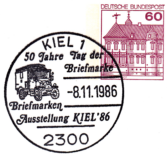 Privatganzsache zum Tag der Briefmarke 1986 in Kiel dem Sonderstempel "50 Jahre Tag der Briefmarke" vom 8.11.1986 aus Kiel.