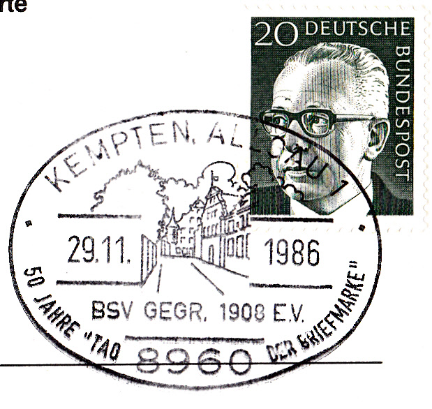 Sonderstempel "50 Jahre Tag der Briefmarke" vom 29.11.1986 aus Kempten im Allgäu.