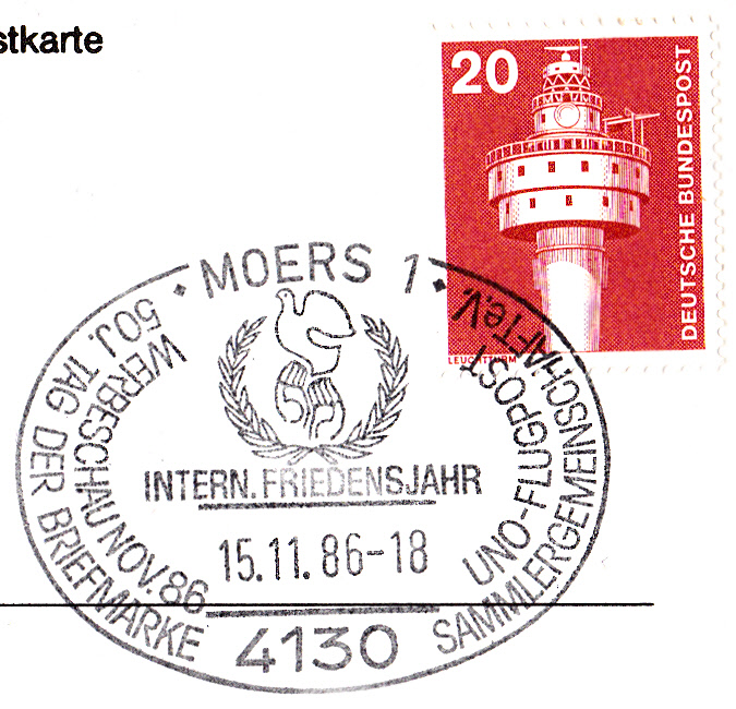 Sonderstempel "50 Jahre Tag der Briefmarke" vom 15.11.1986 aus Moers.