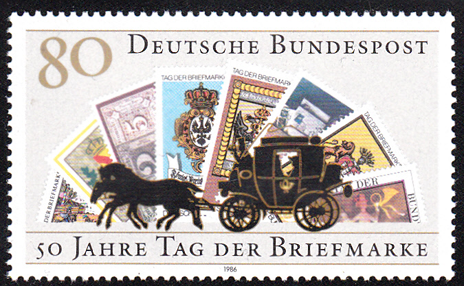 Im Jahre 1986 wurde "50 Jahre Tag der Briefmarke" gefeiert. Aus diesem Anlass gab es am 16.10.1986 eine Sondermarke (MiNr 1300) mit einer Postkutsche vor Marken zum Tag der Briefmarke der Deutschen Bundespost.