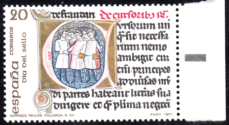 Zum Tag der Briefmarke 1987 erschien in Spanien am 19.9.1987 diese Sondermarke mit einer Abbildung der Postboten von König Jakob II. von Mallorca und einem Teil der Handschrift "Constitutiones Jacobi II. regis Majoricarum" (14. Jh.).