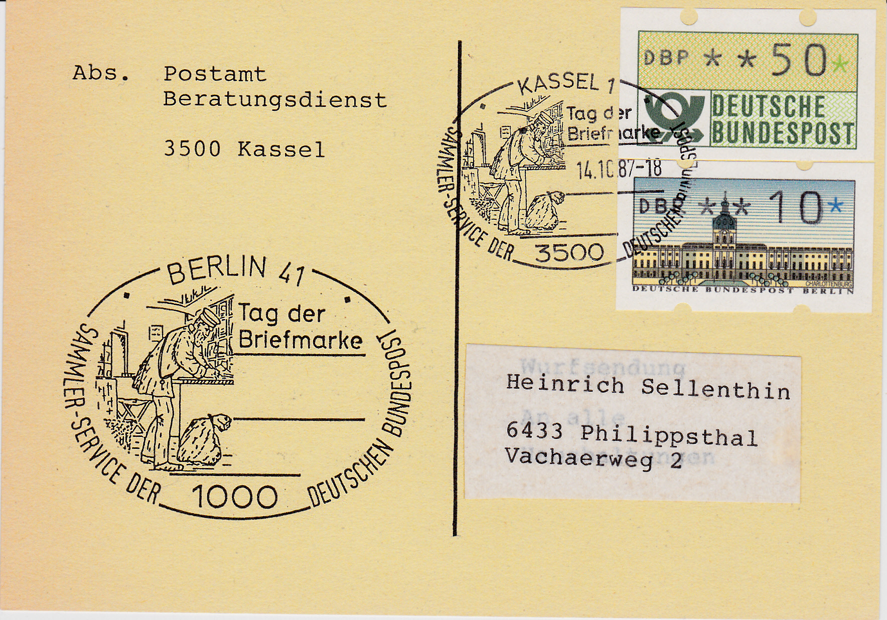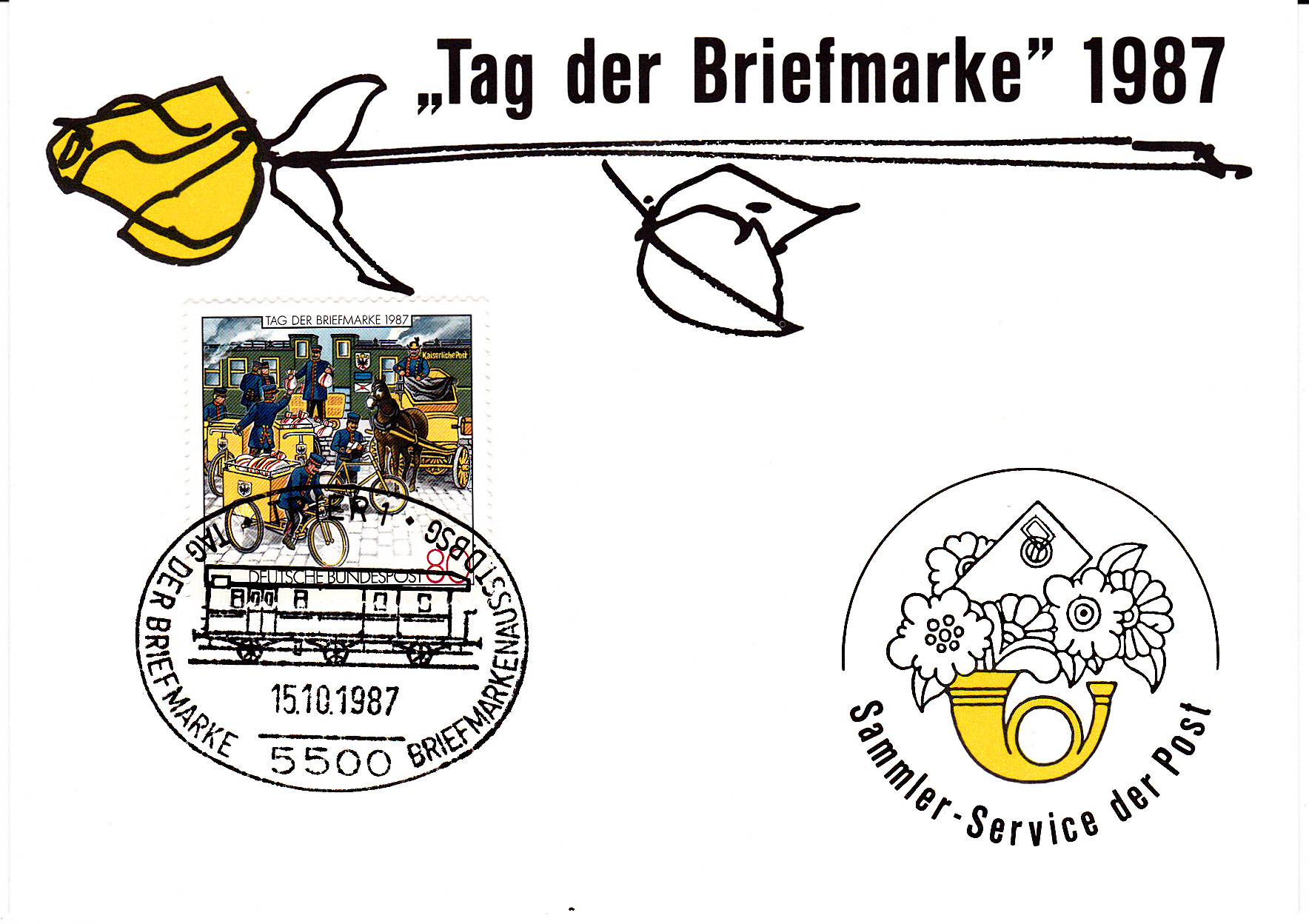 In der Klappkarte des Bundesministers für das Post- und Fernmeldewesen zum 41.Bundestag des BDPh e.V. und zum 88. Deutschen Philatelistentag in Koblenz wurde die Marke zum Tag der Briefmarke als waagerechtes Paar verklebt und mit dem Ersttagsonderstempel Bonn gestempelt.