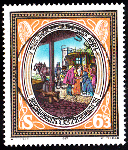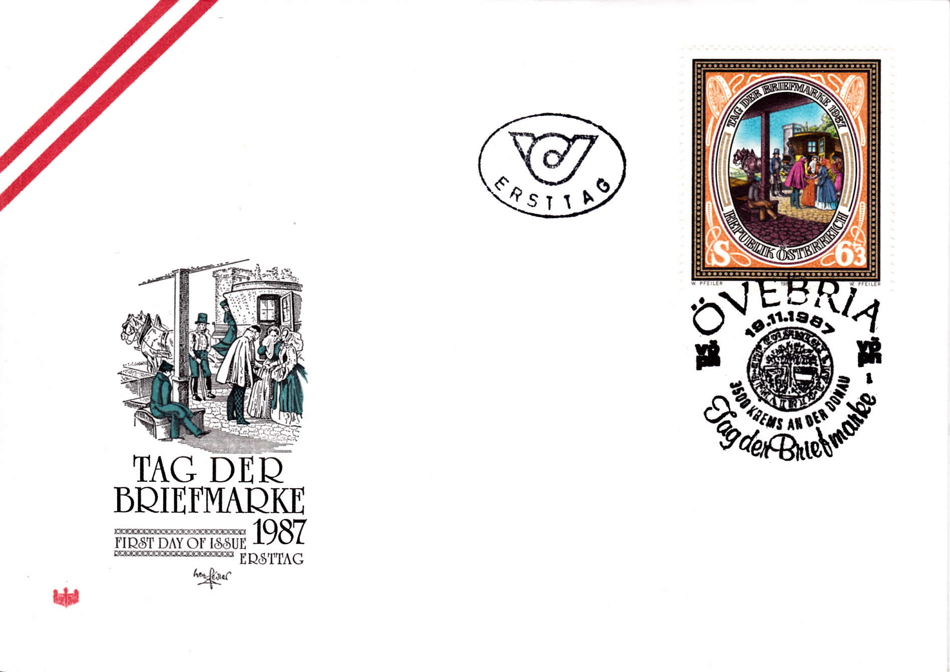Am 19.11.1987 erschien in Österreich eine Sondermarke zum Tag der Briefmarke 1987. Das Markenbild zeigt ein Detail aus der Lithographie "Der Postmeister" von Carl Schustler (1811-1848).