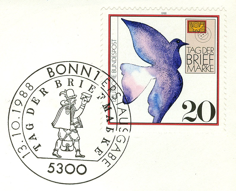 Zum Tag der Briefmarke 1988 wurde das Motiv "Brieftaube" künstlerisch umgesetzt. Hier auf einem FDC (FIDACOS) und Bonner Sonderersttagsstempel.
