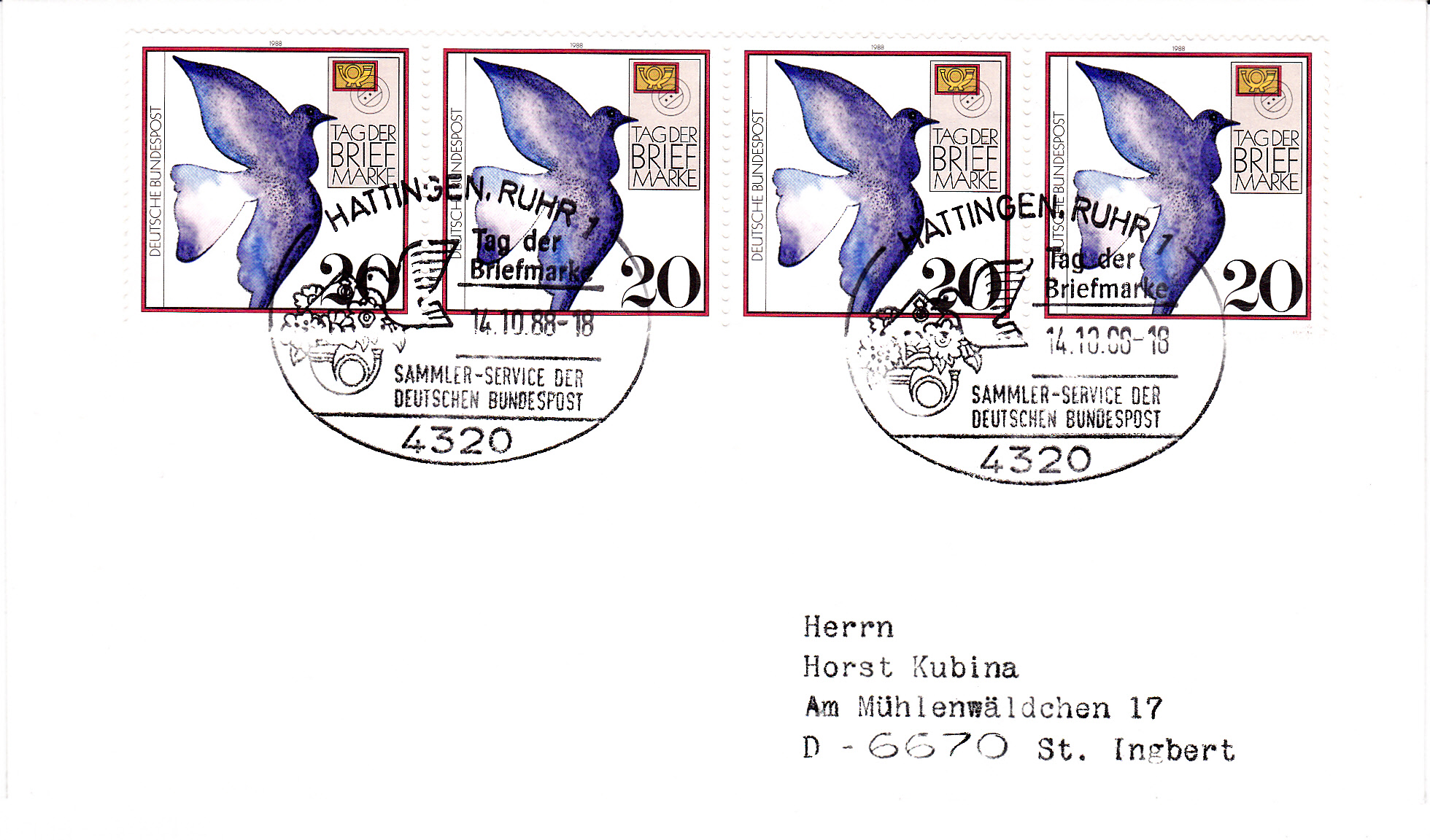 Am 14.10.1988 wurde auch ein Sonderstempel zum Tag der Briefmarke beim Postamt Hattingen geführt.