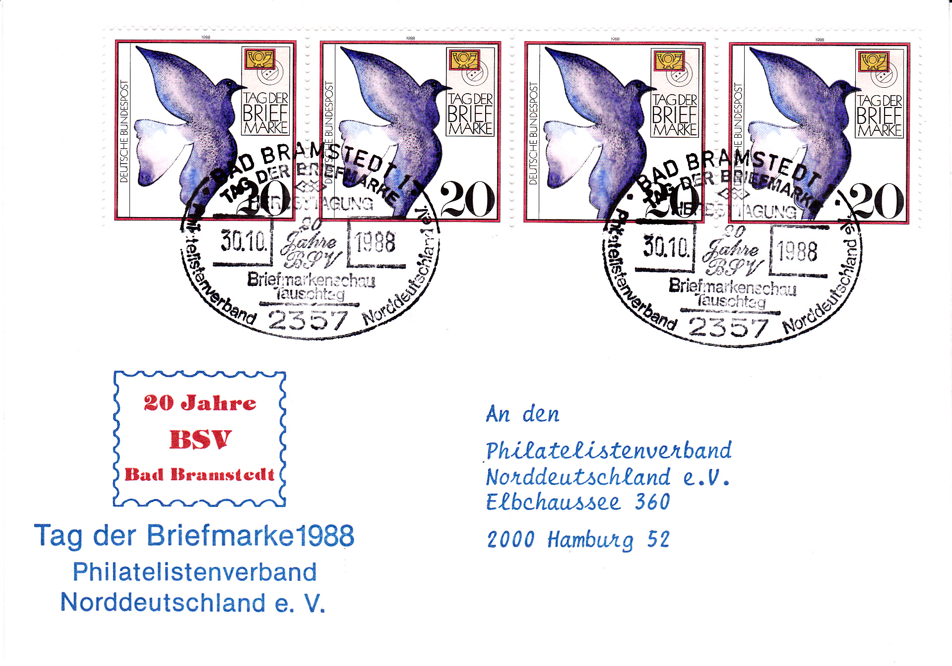 Der Sonderstempel des Philatelistenverbandes Norddeutschland e.V. wurde am 30.10.1988 beim Postamt in Bad Bramstedt 1 geführt.