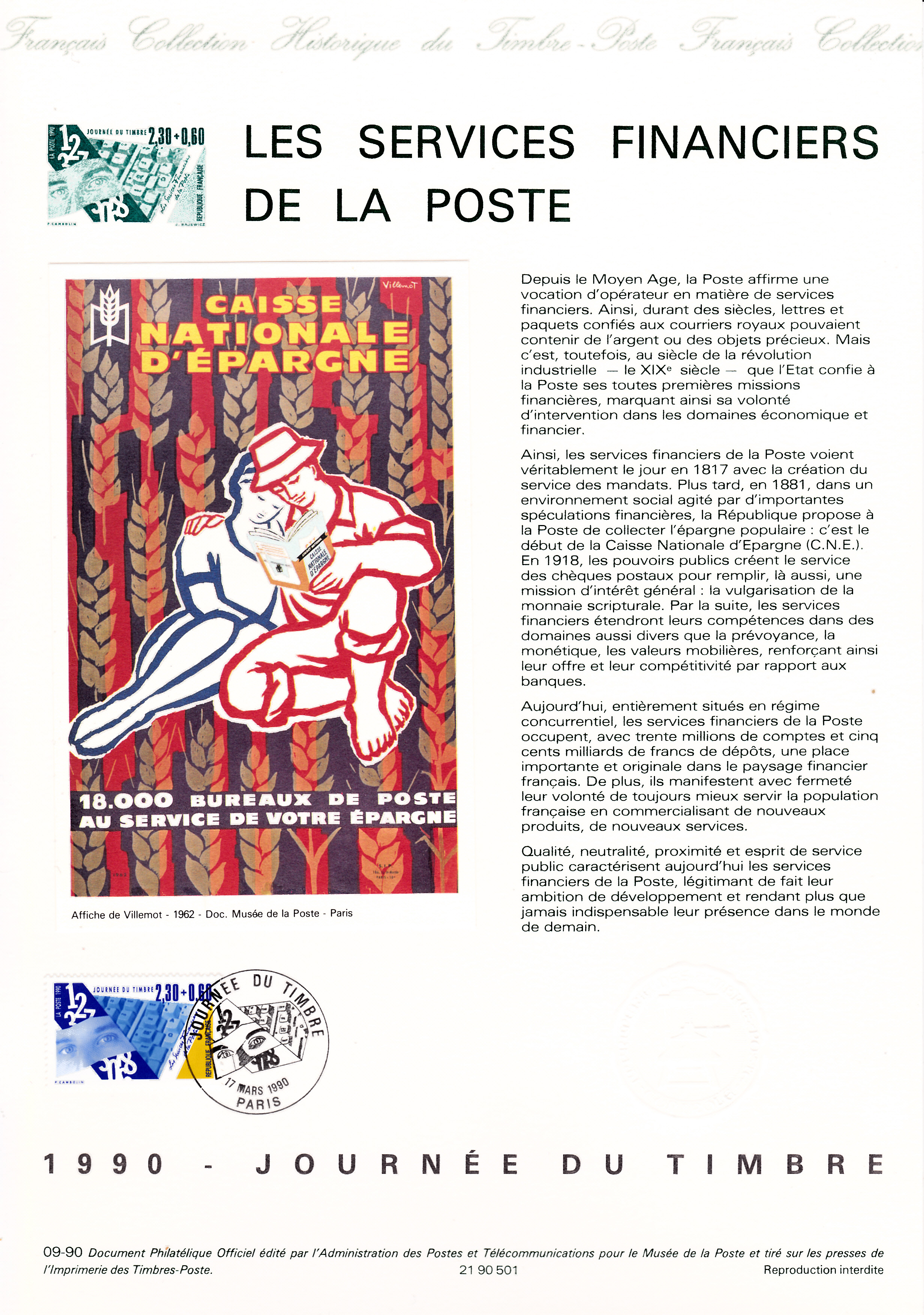 Zum Tag der Briefmarke 1990 ist in Frankreich am 17.3.1990 eine Marke (MiNr 2762) zum Thema "Finanzservice der Post" erschienen.