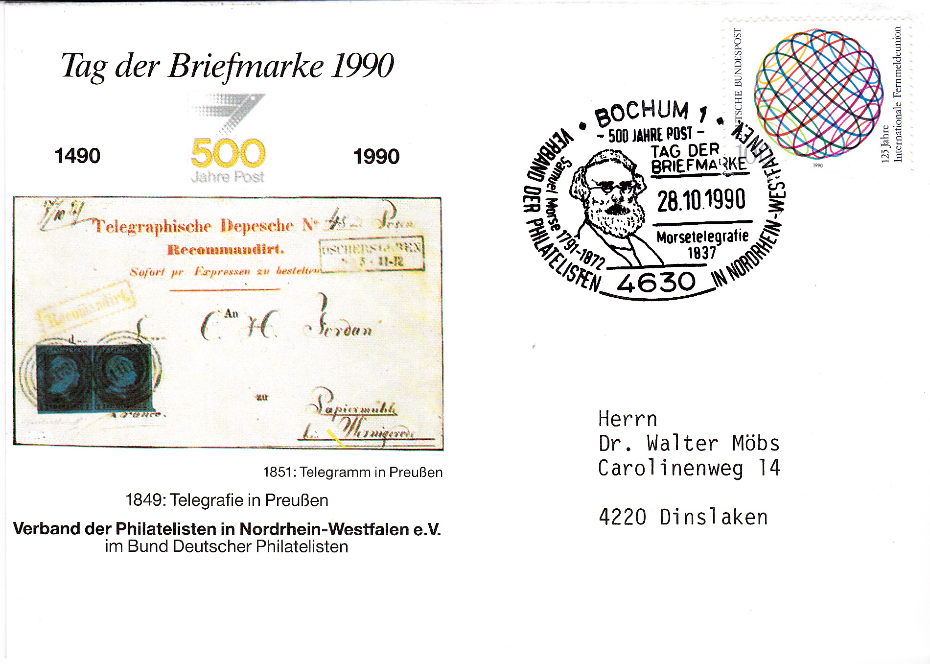 Im Sonderstempel des Verbandes der Philatelisten in Nordrhein-Westfalen aus Bochum vom 28.10.1990 zum Tag der Briefmarke 1990 wird ein Porträt von Samuel Morse gezeigt.