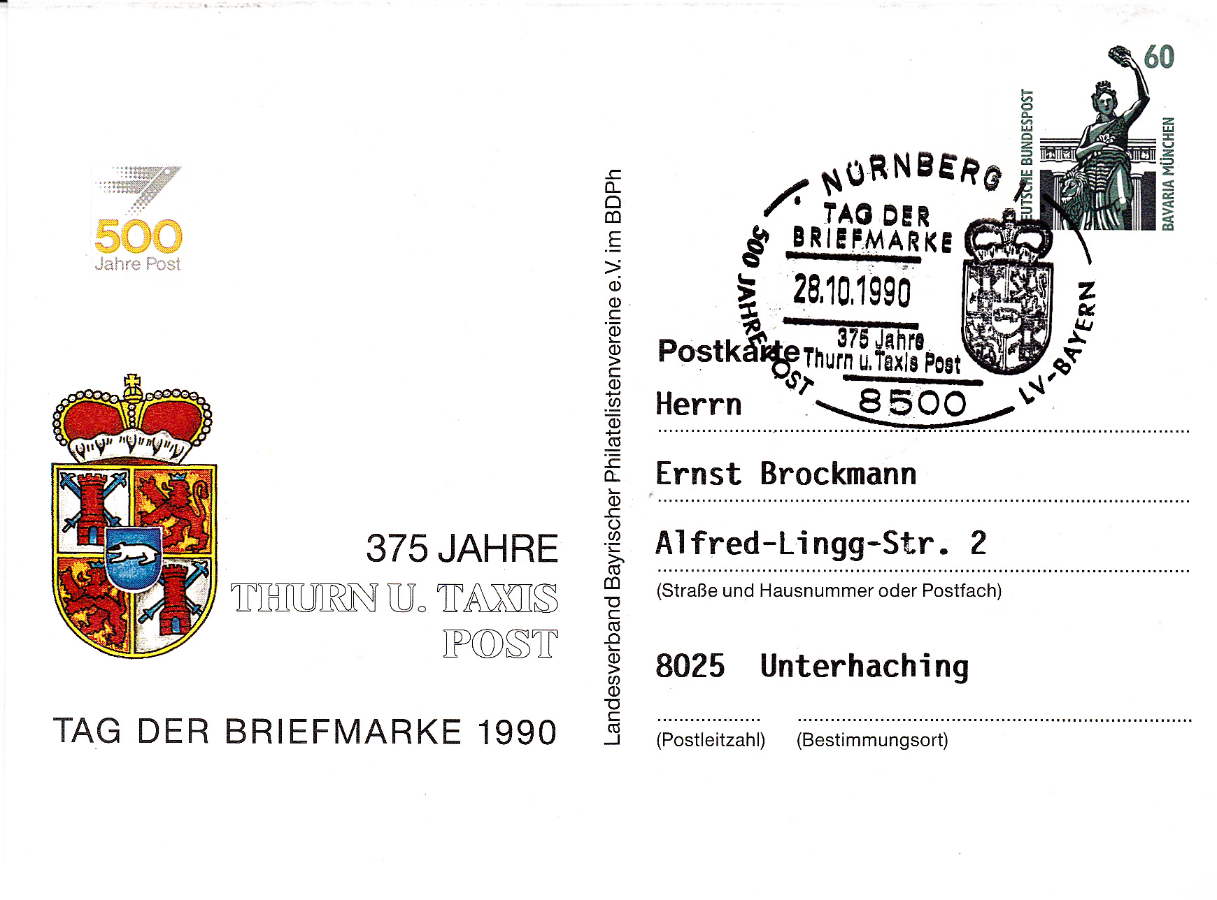 Die Ganzsache des Landesverbandes Bayern zum Tag der Briefmarke 1990 und der dazu passende Sonderstempel aus Nürnberg vom 28.10.1990 sind dem Jubiläum "575 Jahre Thurn und Taxis Post" gewidmet.