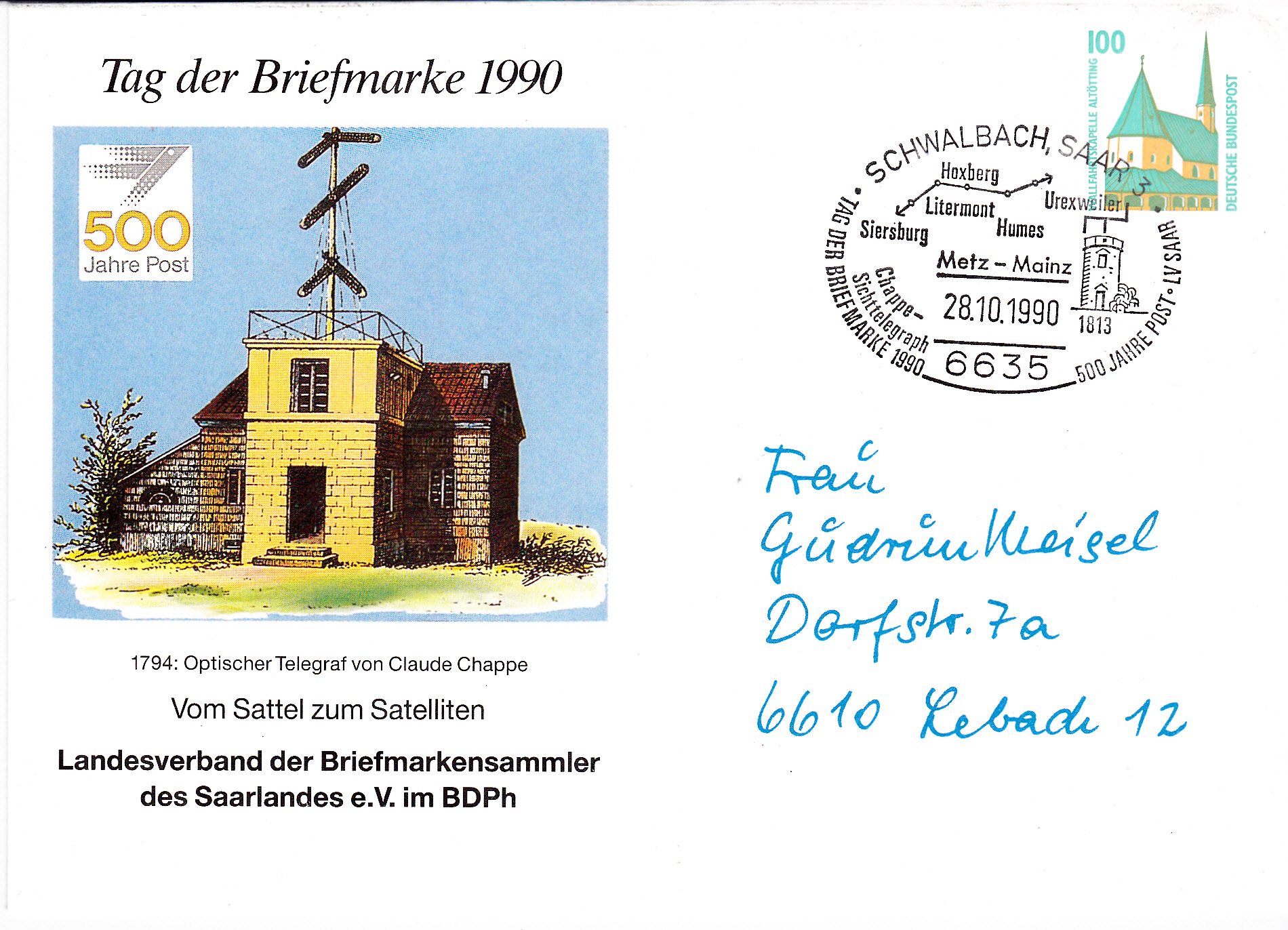 Es folgt hier die Ganzsache des LV der Briefmarkensammler des Saarlandes e.V. mit dem dazupassenden Sonderstempel aus Schwalbach zum Thema "Optische Telegrafie".
