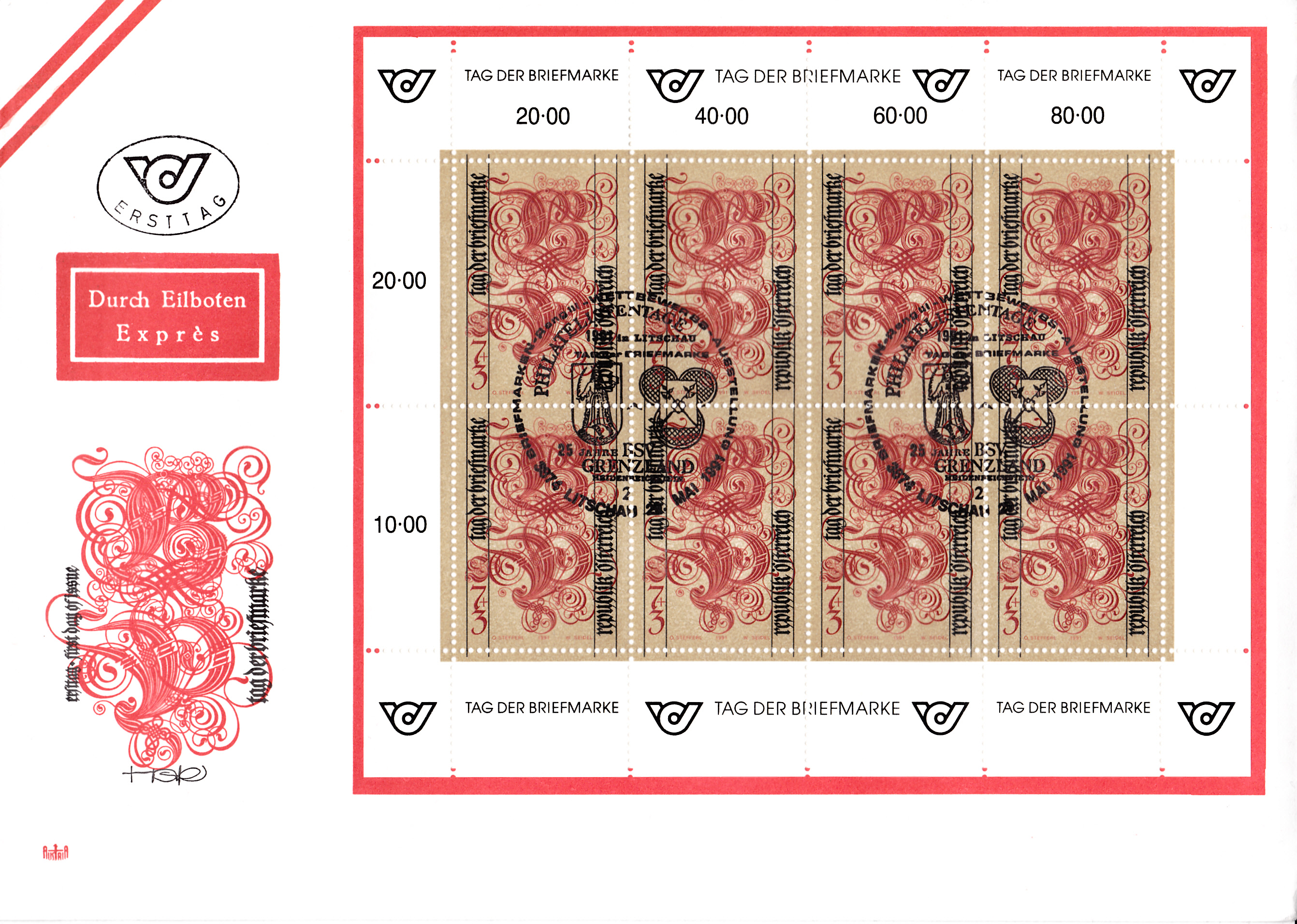 Diese Marke ist im Bogen zu je 8 Marken erschienen. Hier wurde ein FDC mit dem kompletten Bogen angefertigt. Der Stempel zum Tag der Briefmarke 1991 aus Litschau trägt die Kennziffer "3".