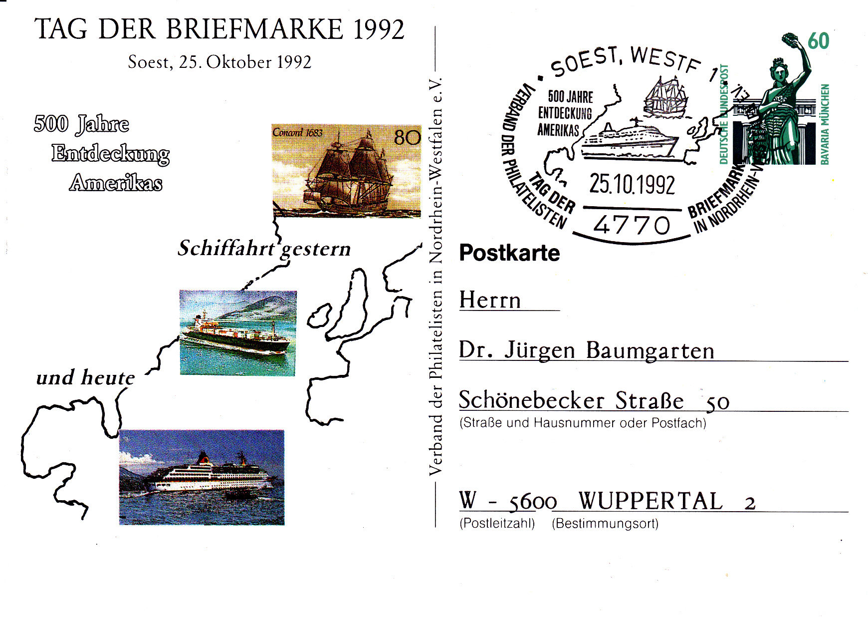 Der Philatelistenverband Norddeutschland bildete auf seiner Ganzsache den Auswanderersegler "Hamburg" der HAPAG ab. Die Hamburg-Amerikanische Packetfahrt-Actien-Gesellschaft (HAPAG) war eine deutsche Reederei, die am 27. Mai 1847 in Hamburg gegründet wurde. Das erste Schiff der HAPAG war das Vollschiff "Deutschland" von 538 BRT, ausgerüstet für 20 Kajütpassagiere sowie 200 Auswanderer und Fracht. Das Hauptgeschäft war der Transport von Passagieren, vor allem Auswanderern. Am 15. Oktober 1848 begann die HAPAG den Liniendienst mit der Deutschland zwischen Hamburg und New York. Die Linien der Reederei umspannten im Laufe der Zeit die ganze Welt. Nach 123 Jahren fusionierte die HAPAG am 1. September 1970 mit dem Bremer Norddeutschen Lloyd zur Hapag-Lloyd AG. Im Stempelbild des Sonderstempel aus 2000 Norderstedt 1 ist das Haupttor der Auswandererhalle Hamburg zu sehen. Diese wurden 1901 von der HAPAG auf der Veddel eröffnet. Die Anlage bot in 15 Gebäuden Platz für 1200 Personen. Es gab fünf Schlaf- und Wohnpavillions, zwei bequemere Unterkünfte, eine große Speisehalle, Wasch- und Sanitäreinrichtungen in jedem Schlafpavillion, eine Synagoge und eine Kirche für die beiden christlichen Konfessionen sowie ein Verwaltungsgebäude. Darüber hinaus gab es einen Musikpavillion, in dem Konzerte stattfanden, ein Lazarett, Gepäckschuppen und einen Stall. 1905 wurden in der Nähe weitere acht Baracken errichtet.