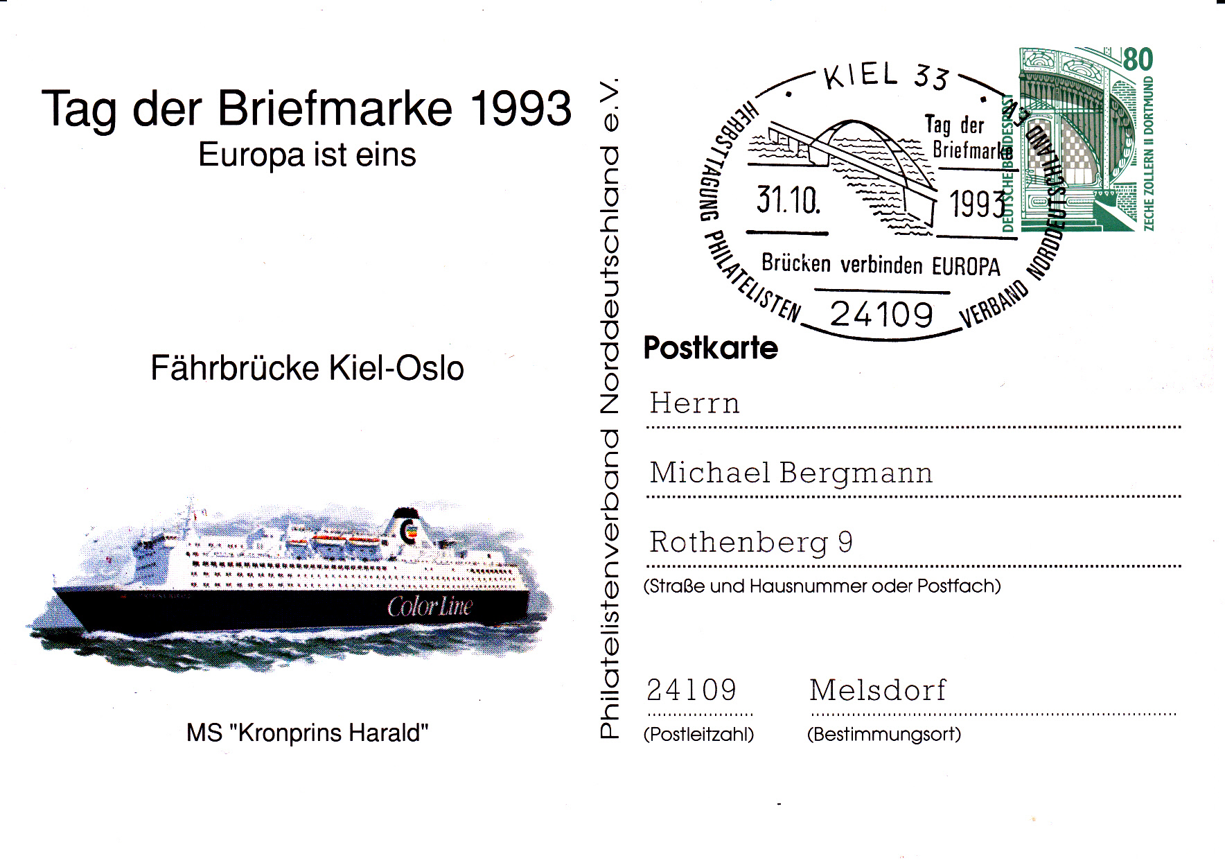 Der Philatelistenverband Norddeutschland feierte den Tag der Briefmarke 1993 in 24109 Kiel mit einem Sonderstempel zum Thema "Brücken verbinden Europa" und der Ganzsache mit der MS "Kronprins Harald", die von 1987 bis 2004 als Fähre auf der Linie Kile - Oslo eingesetzt war.