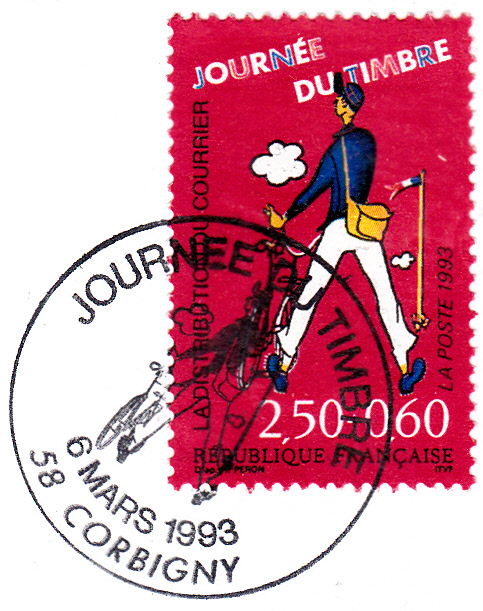 Im Markenbild der am 6.3.1993 erschienenen französischen Zuschlagsmarke zum Tag der Briefmarke (MiNr 2939, die Marke gibt es in zwei Papierarten x = Papier normal, y = Papier ph.) wird der französische Schauspieler, Regisseur und Drehbuchautor Jacques Tati als Postbote nach einem Plakat zum Film "Jour de fête" vorgestellt. Hier ein Ersttagsbrief der Fédération des Sociétés Philatéliques Francaises mit einem motivgleichen Sonderstempel aus Corbigny vom Ersttag. Das komplette Plakat zum Film wird als Illustration des Briefes benutzt.