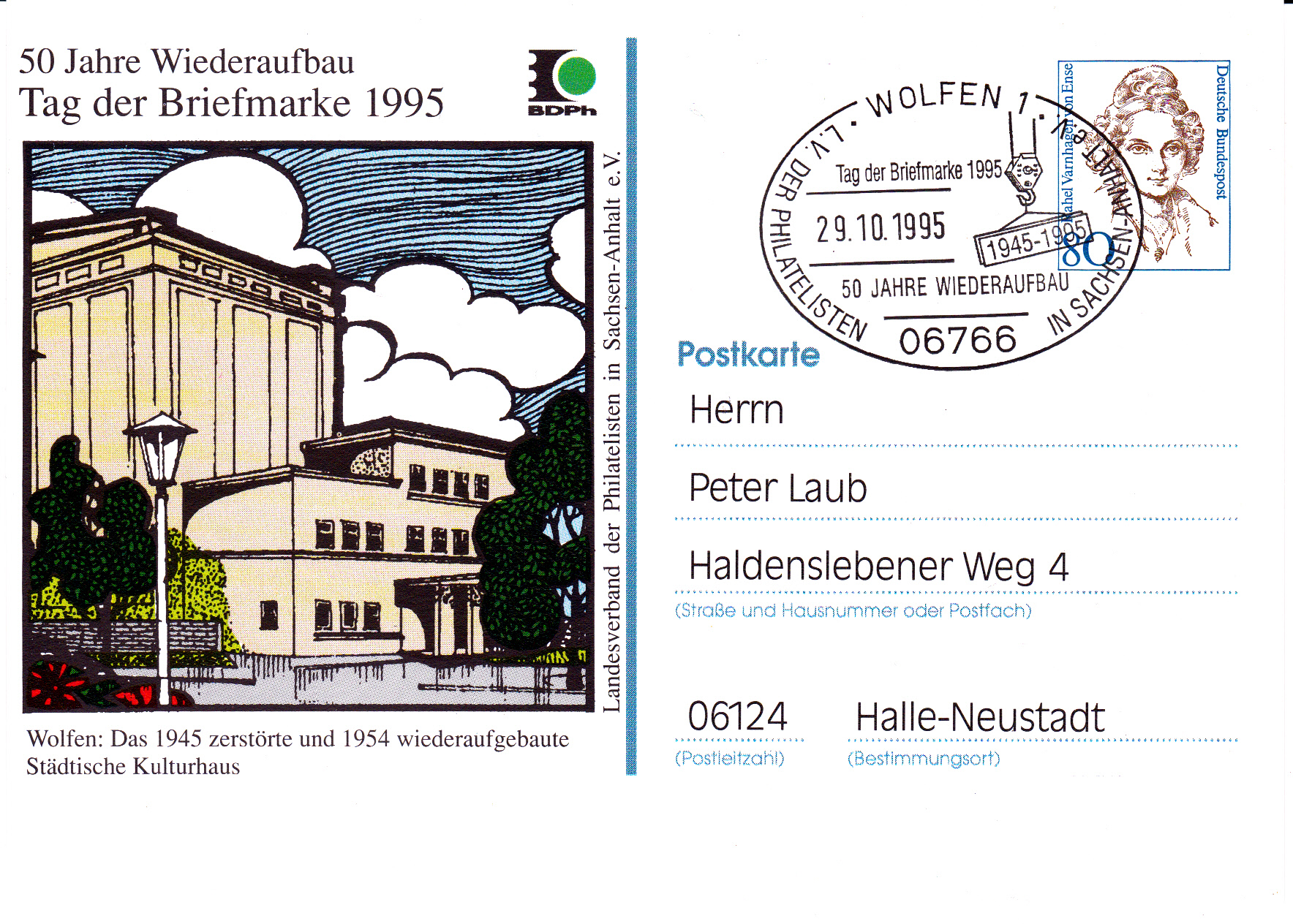 Der Landesverband der Philatelisten in Sachsen-Anhalt e.V. wählte als Motiv für seine Ganzsachenpostkarte zum Tag der Briefmarke 1995 das Städtische Kulturhaus in Wolfen. Der dazu passende Sonderstempel wurde am 29.10.1995 in 06766 Wolfen 1 geführt.