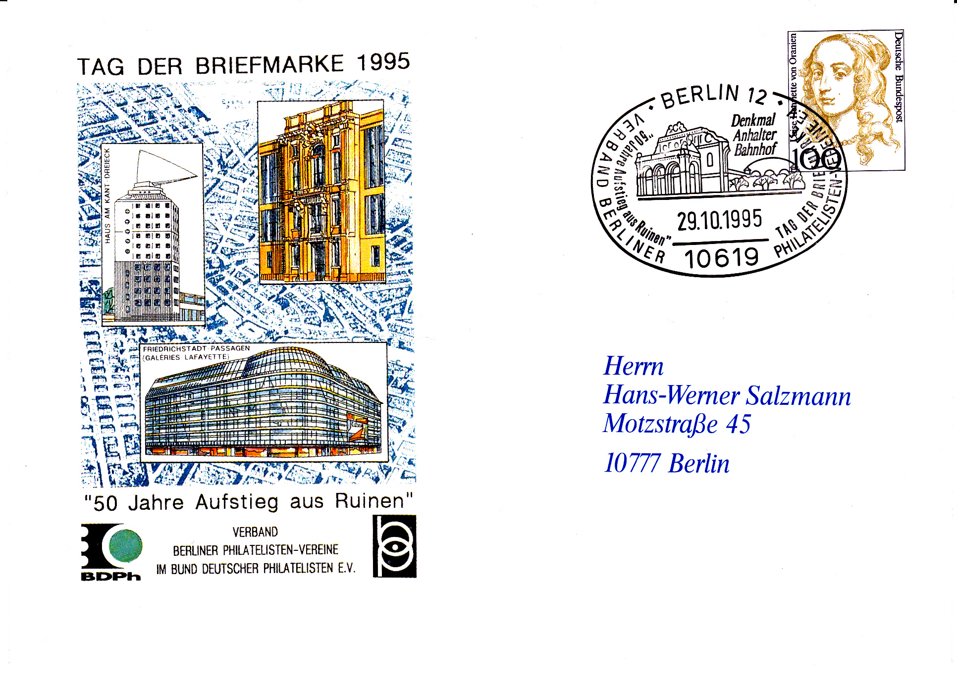 Ganzsachenumschlag zum Tag der Briefmarke 1995 des Verbandes Berliner Philatelisten-Vereine mit dem dazugehörenden Sonderstemepel aus 10619 Berlin 12.