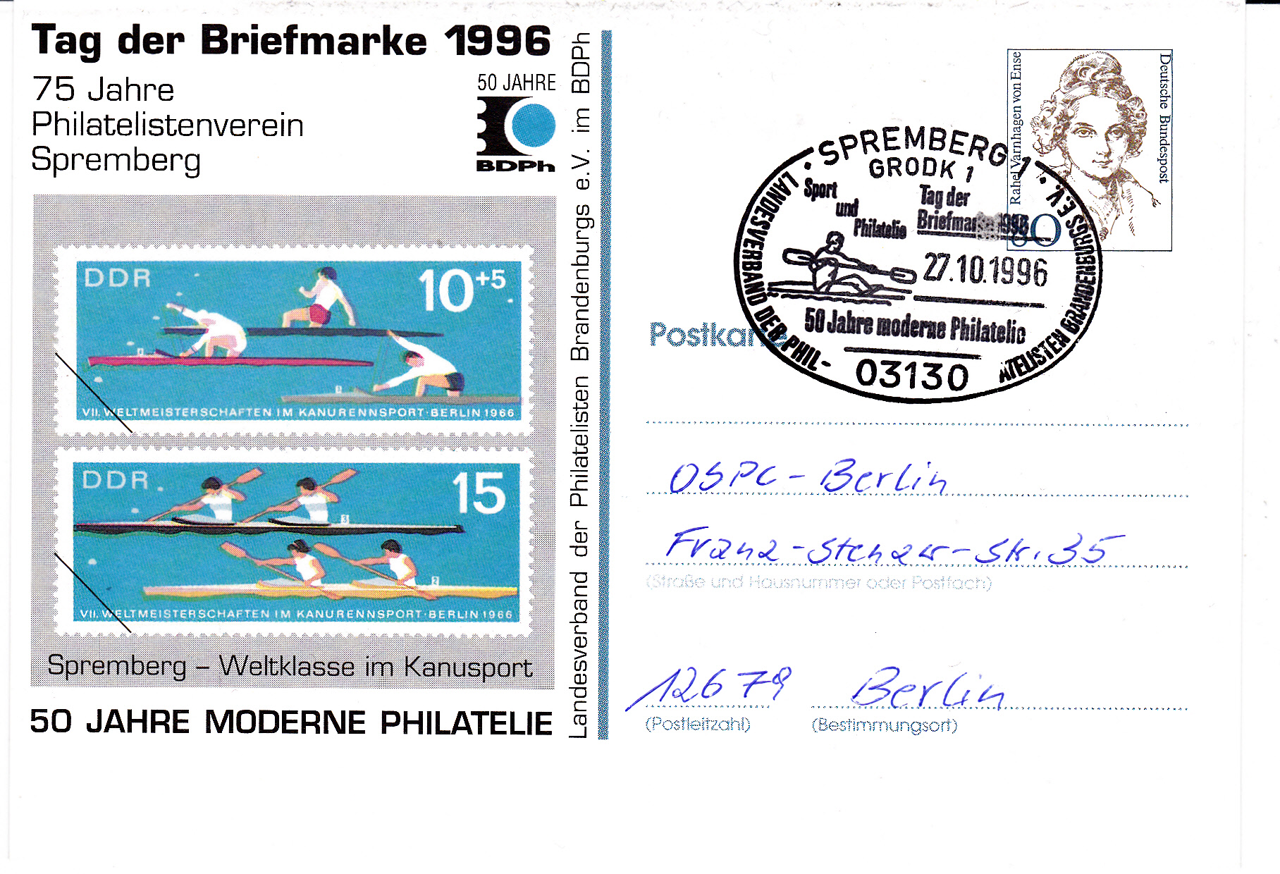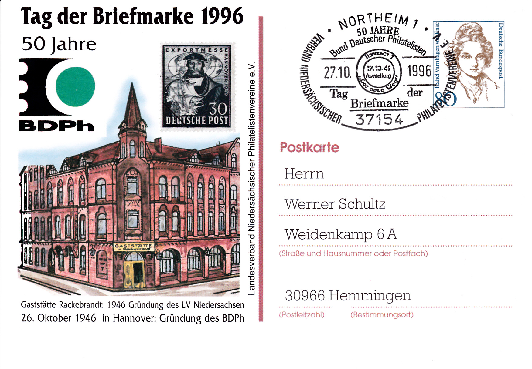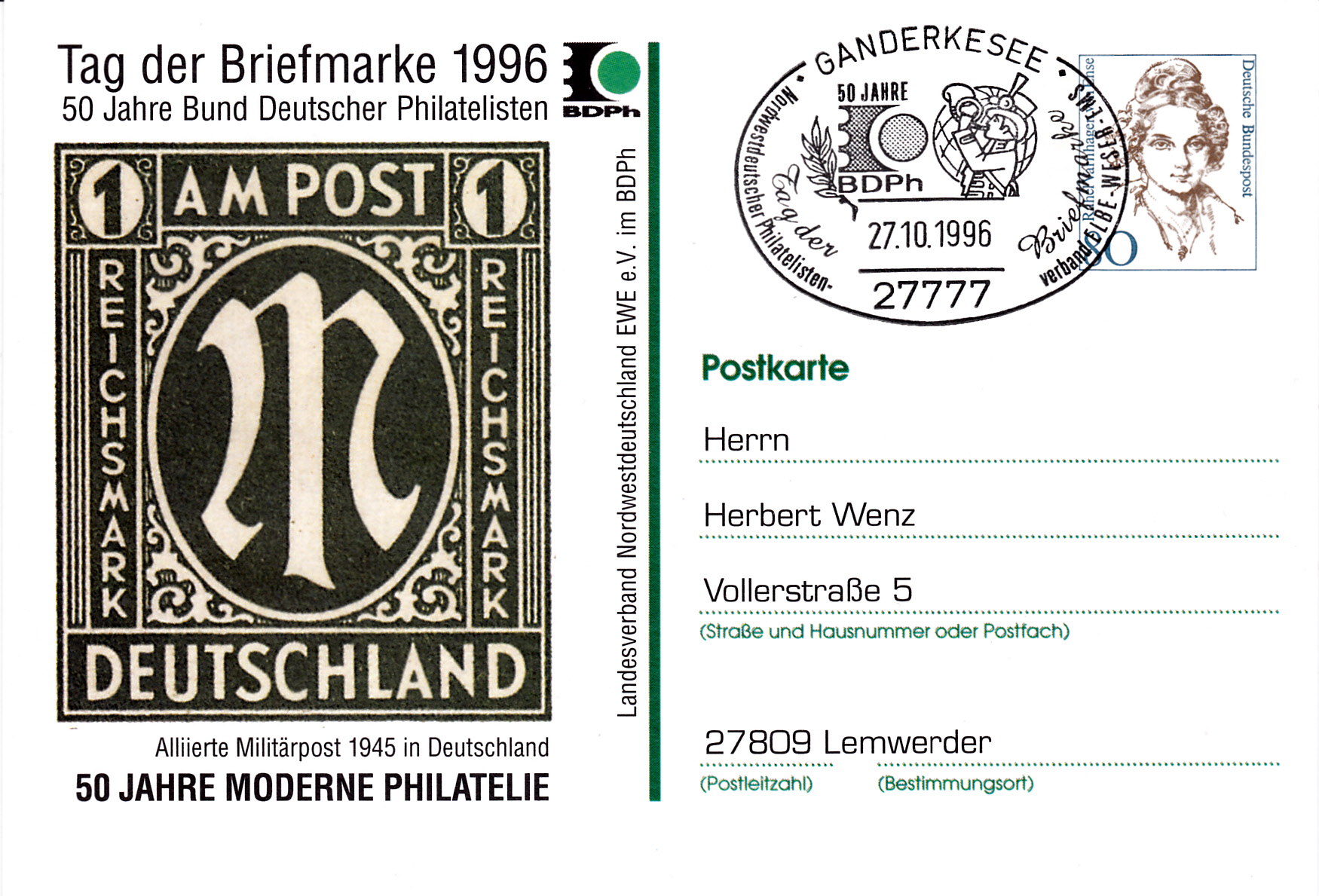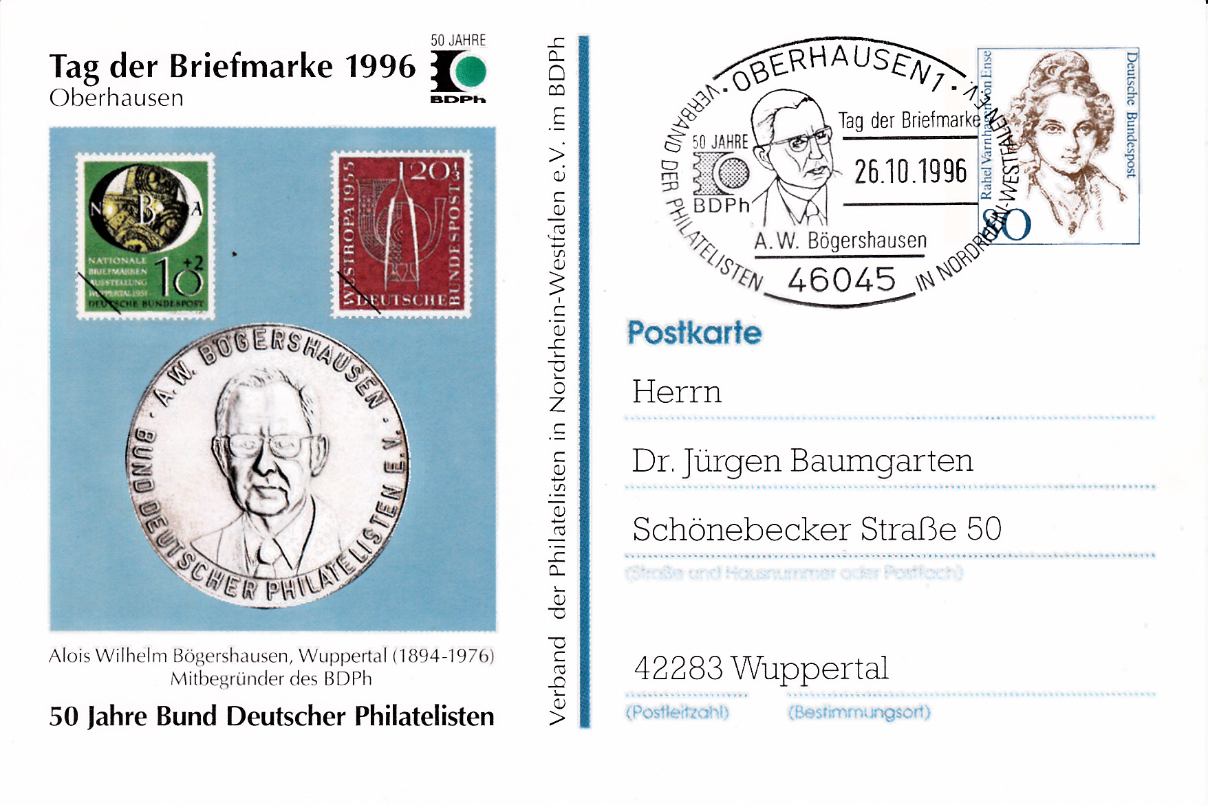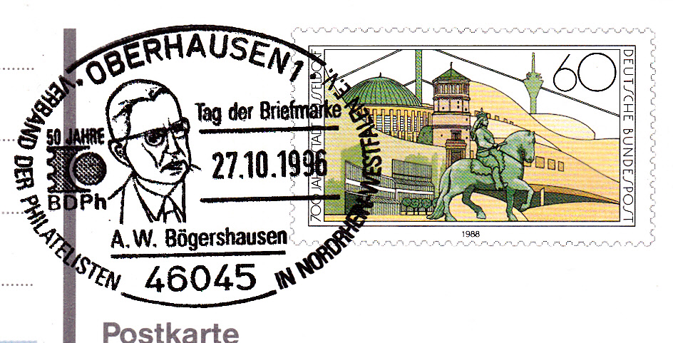Sonderstempel aus Oberhausen vom 27.10.1996 zum Tag der Briefmarke 1996 mit einem Portrait von A.W. Bögershausen. dem langjährigen Vorsitzenden des Verbandes der Philatelisten in Nordrhein-Westfalen e.V. und ehemaligen Vizepräsidenten des Bundes Deutscher Philatelisten e.V.