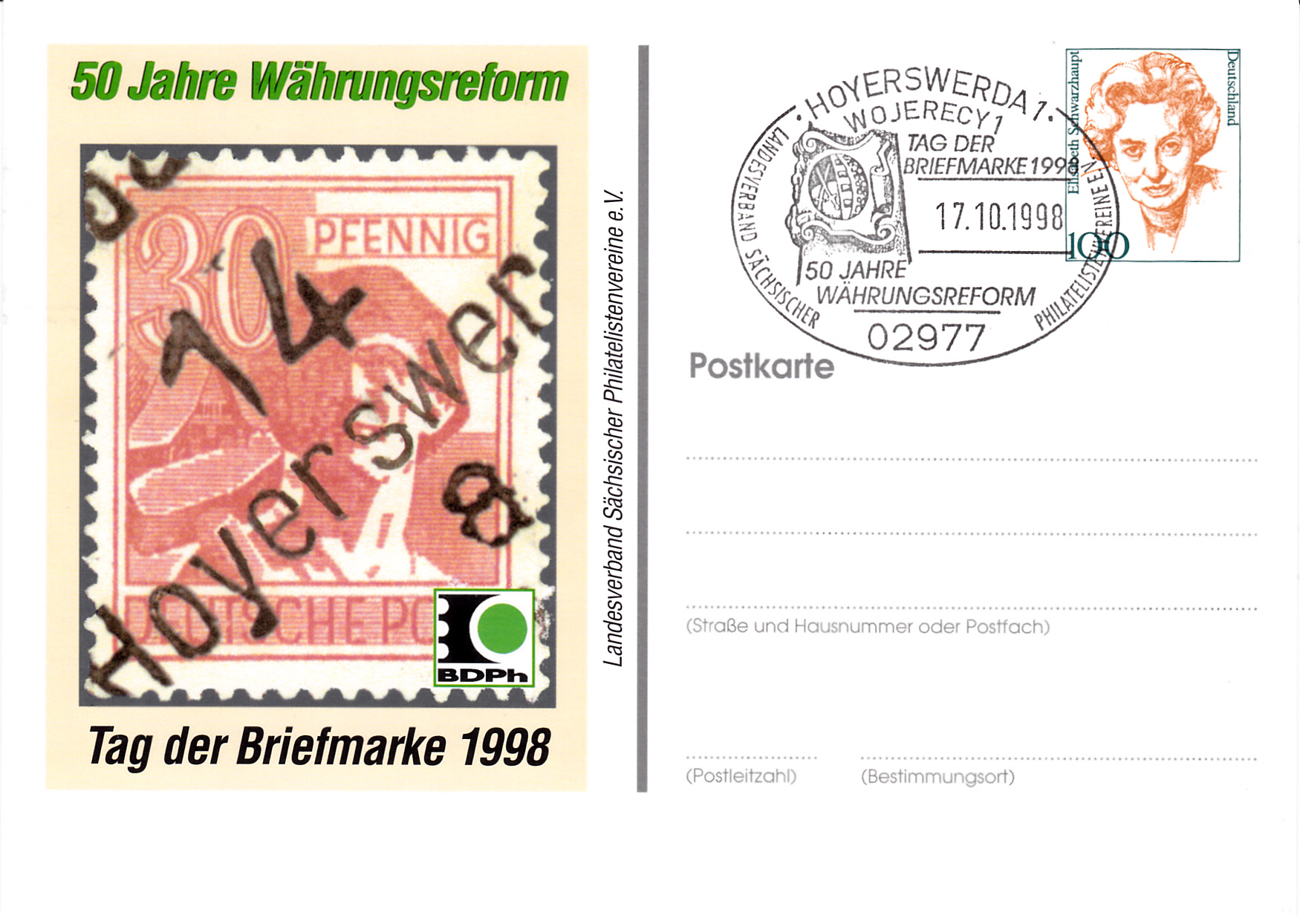 Ganzsache des LV Sächsischer Philatelistenvereine e.V. mit dem dazu passenden Sonderstempel vom 17.10.1998 aus Hoyerswerda zum Tag der Briefmarke 1998.