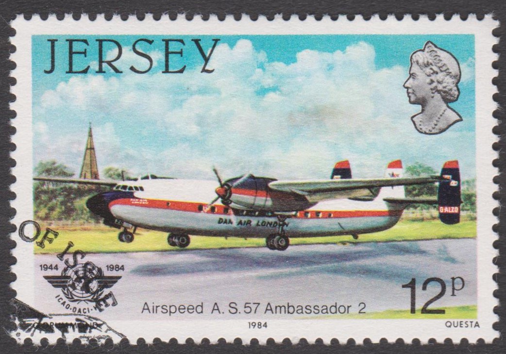 Dieses Postwertzeichen aus Jersey zeigt eine Airspeed AS.57 Ambassador der "DAN-AIR LONDON":