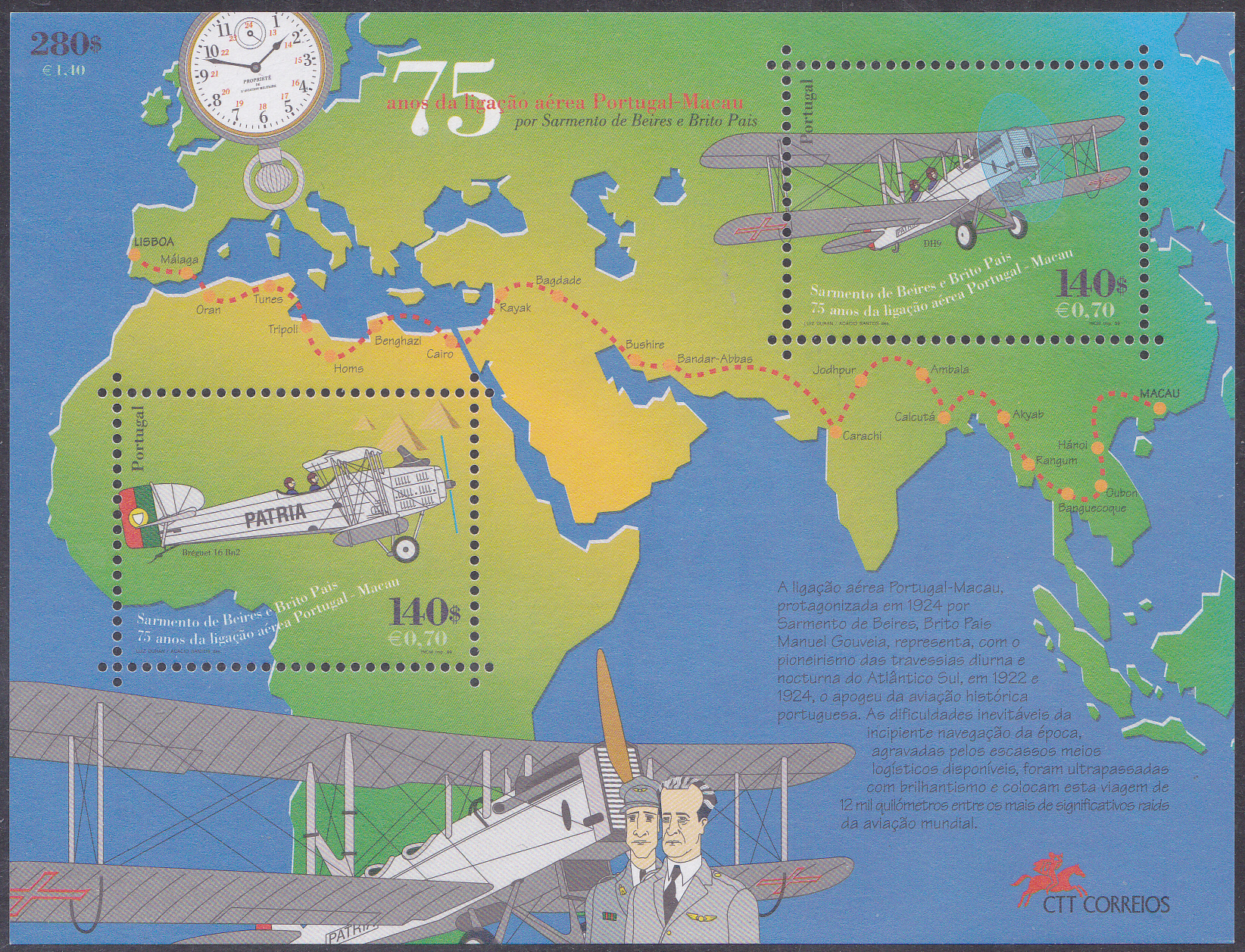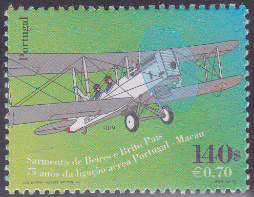 Zum 75. Jahrestag des ersten Fernstreckenfluges Portugal-Macau erschien in Portugal diese Marke (MiNr 2333) mit der Abbildung des Doppeldeckers De Havilland D.H.9 "Patria" aus dem Jahre 1924.