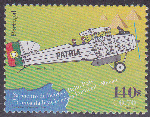 Zum 75. Jahrestag des ersten Fernstreckenfluges Portugal-Macau erschien in Portugal diese Marke (MiNr 2334) mit der Abbildung des Doppeldeckers Breguet 16 Bn2 "Patria" aus dem Jahre 1924.