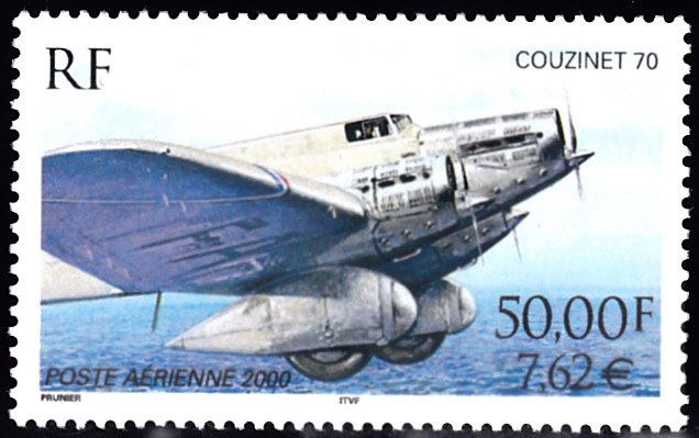 Aus Frankreich kommt diese Marke (MiNr 3441) mit der Abbildung des Flugzeugs Couzinet 70 Arc-en-Ciel.
