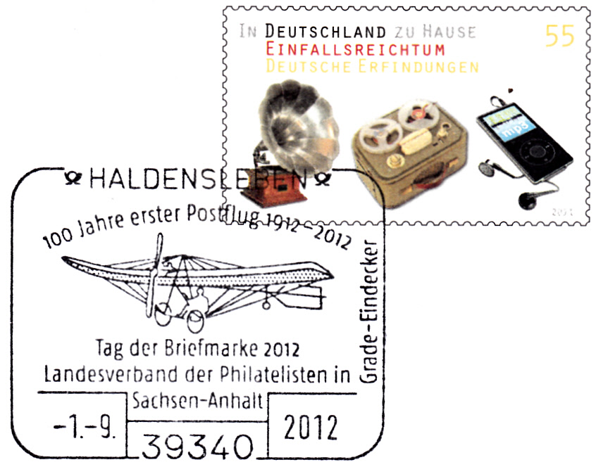 Sonderstempel aus Haldensleben vom 1.9.2012 zum Tag der Briefmarke 2012 und zum Jubiläum "100 Jahre erster Postflug" auf einem Plusbrief (MiNr USo 250) mit Zudruck. Im Stempel wird das Flugzeug gezeigt, im Zudruck Hans Grade mit Flugzeug.