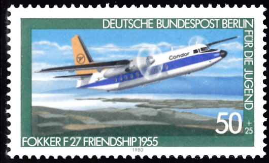 Auf dieser Marke aus Berlin (MiNr 618) sehen wir eine Verkehrsflugzeug Fokker F-27 Friendship der Fluggesellschaft Condor.