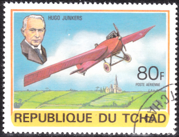 Auf einer Marke aus dem Tschad (MiNr 825) können wir die Junkers J 1 und ein Porträt von Hugo Junkers sehen.