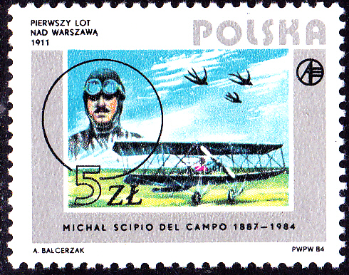 Am 13. August 1911 flog Michał Scipio del Campo (geb. 26. Jan. 1887 in Rajki bei Berdyczów, gest. 7. März 1984 in Katowice; polnischer Flieger, Hütteningenieur und Thermodynamiker) in einer "Etrich Taube" (als erster Pole) über Warschau. Der Flug dauerte 18 Minuten.