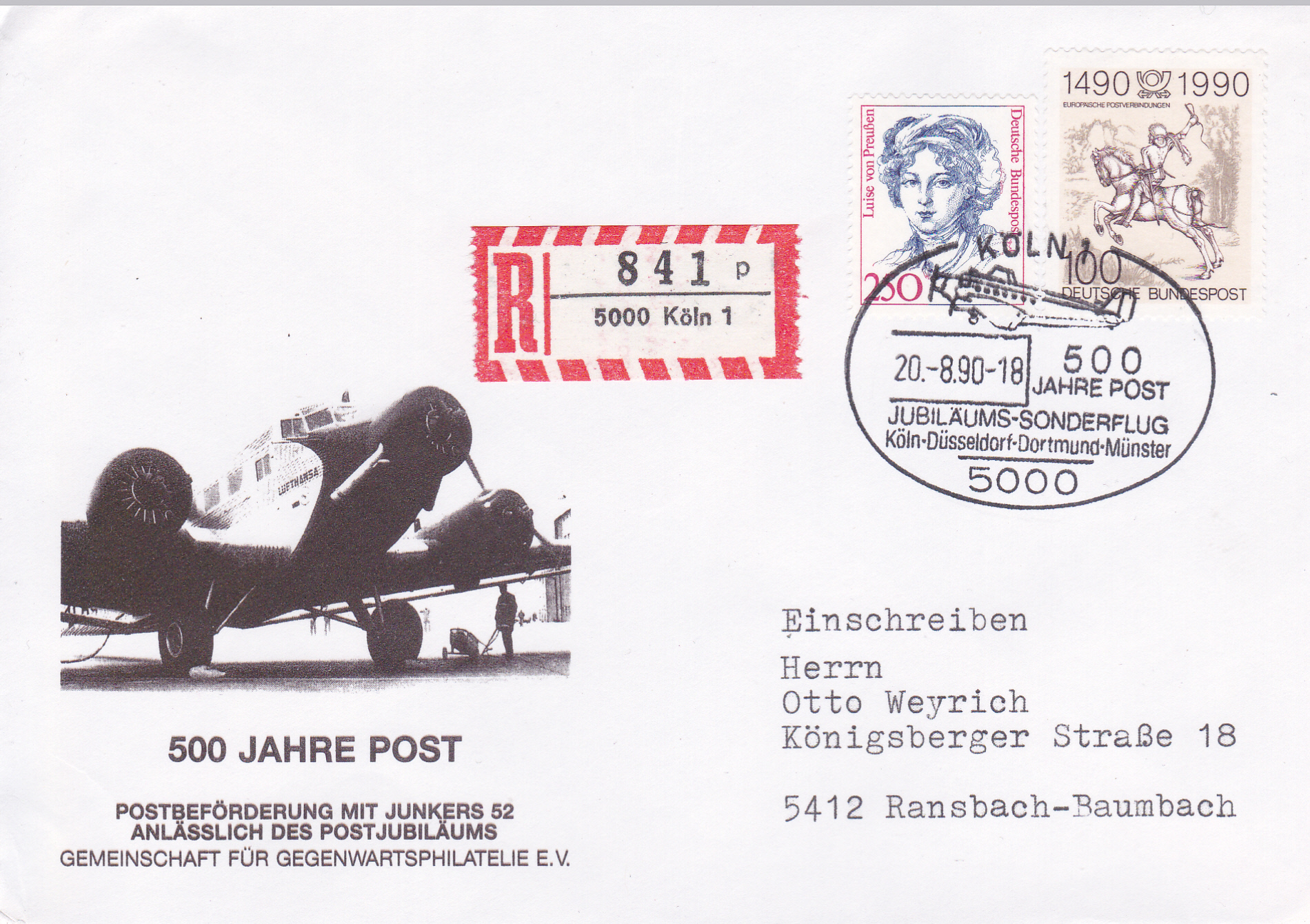 Zum Jubiläum "500 Jahre Post" wurde ein Jubiläums-Sonderflug Köln-Düsseldorf-Dortmund-Münster mit Postbeförderung durchgeführt, wie dieser Brief mit Einschreiben und mit dem passenden Sonderstempel aus Köln belegt.