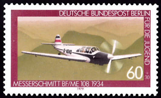 Auf dieser Marke aus Berlin (MiNr 594) ist eine Messerschmitt Bf 108 abgebildet.