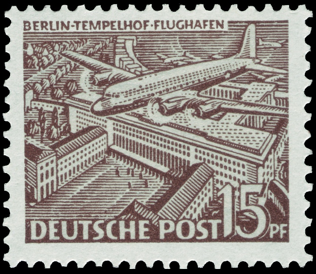 Die am 30.05.1949 in Berlin erschienene Freimarke der Wertstufe 15 Pfennig, MiNr. 48, zeigt als Motiv eine DOUGLAS DC-4 über dem Flughafen Berlin-Tempelhof:
