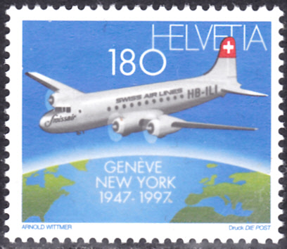 Die Marke aus der Schweiz (MiNr 1609) zum Thema "50 Jahre Nordatlantikflüge der Swissair" bildet eine Douglas DC-4 auf dem Flug von Genf nach New York im Jahre 1947 ab.