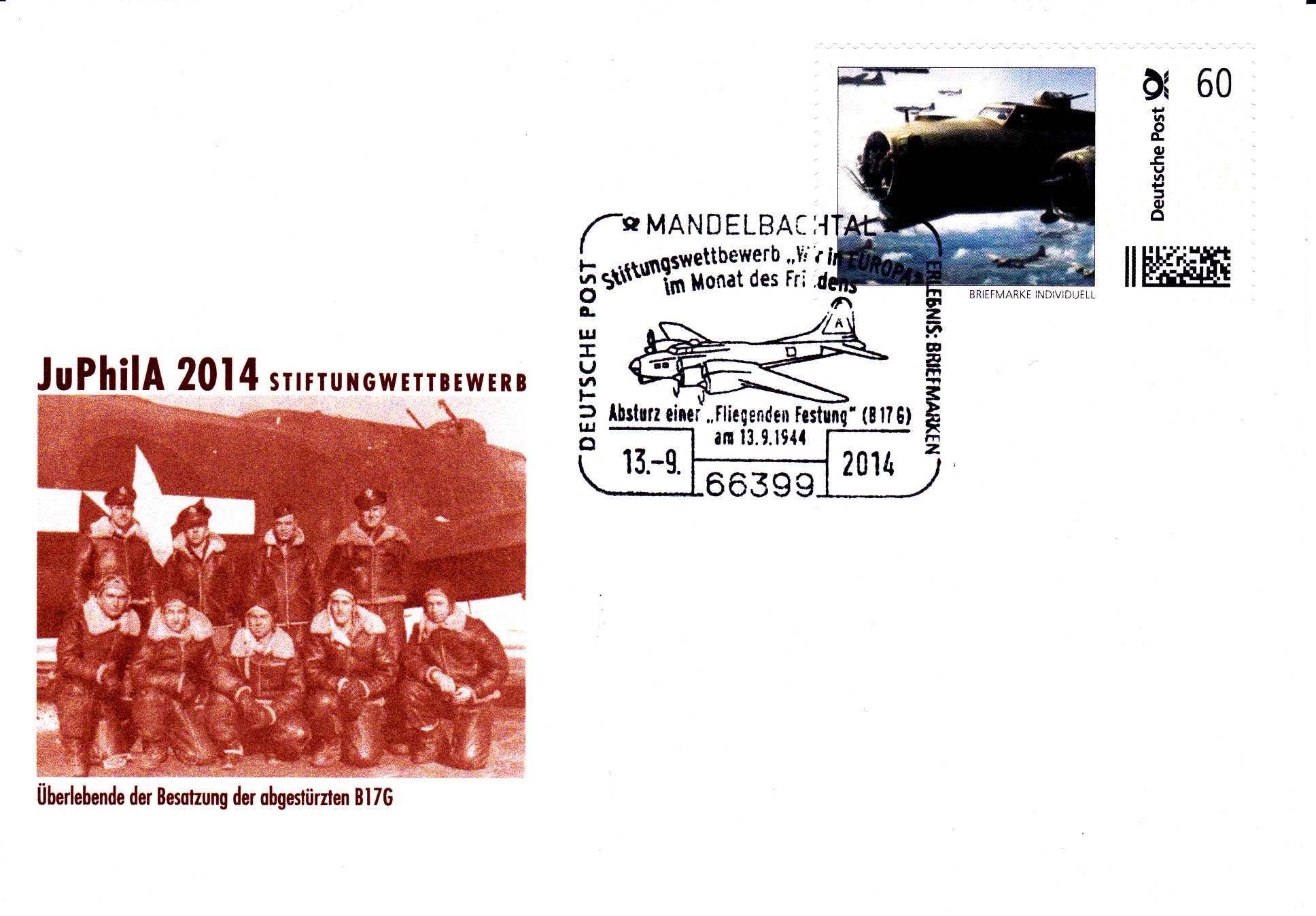 Passend zu den Marken gab es einen Sonderstempel am 13.9.2014 zum 70. Jahrestag des Absturzes einer B-17 G bei Mandelbachtal-Bebelsheim.