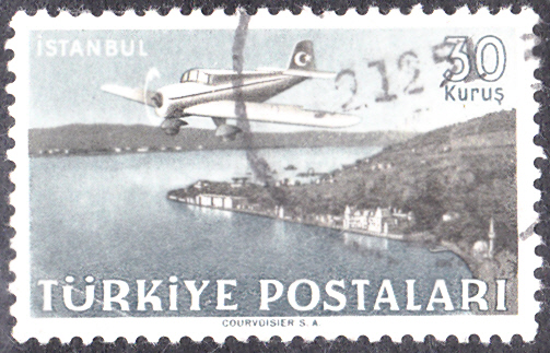 Auf dieser Marke der Türkei (MiNr 1227) ist eine Curtiss-Wright CW-22 über Istanbul abgebildet.