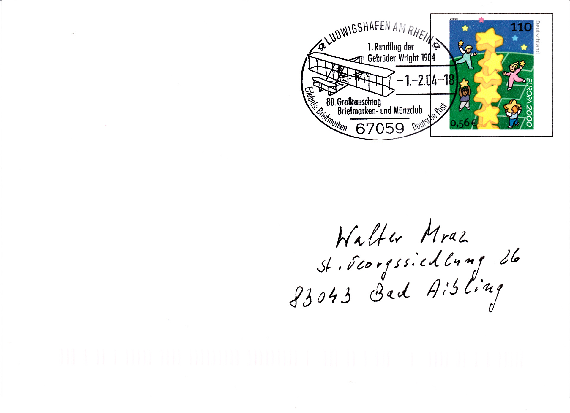 Sonderstempel vom 1.2.2004 aus Ludwigshafen mit einer Abbildung des "Wright Flyer" der Gebrüder Wright auf einem Plusbrief (MiNr USo 20 I).