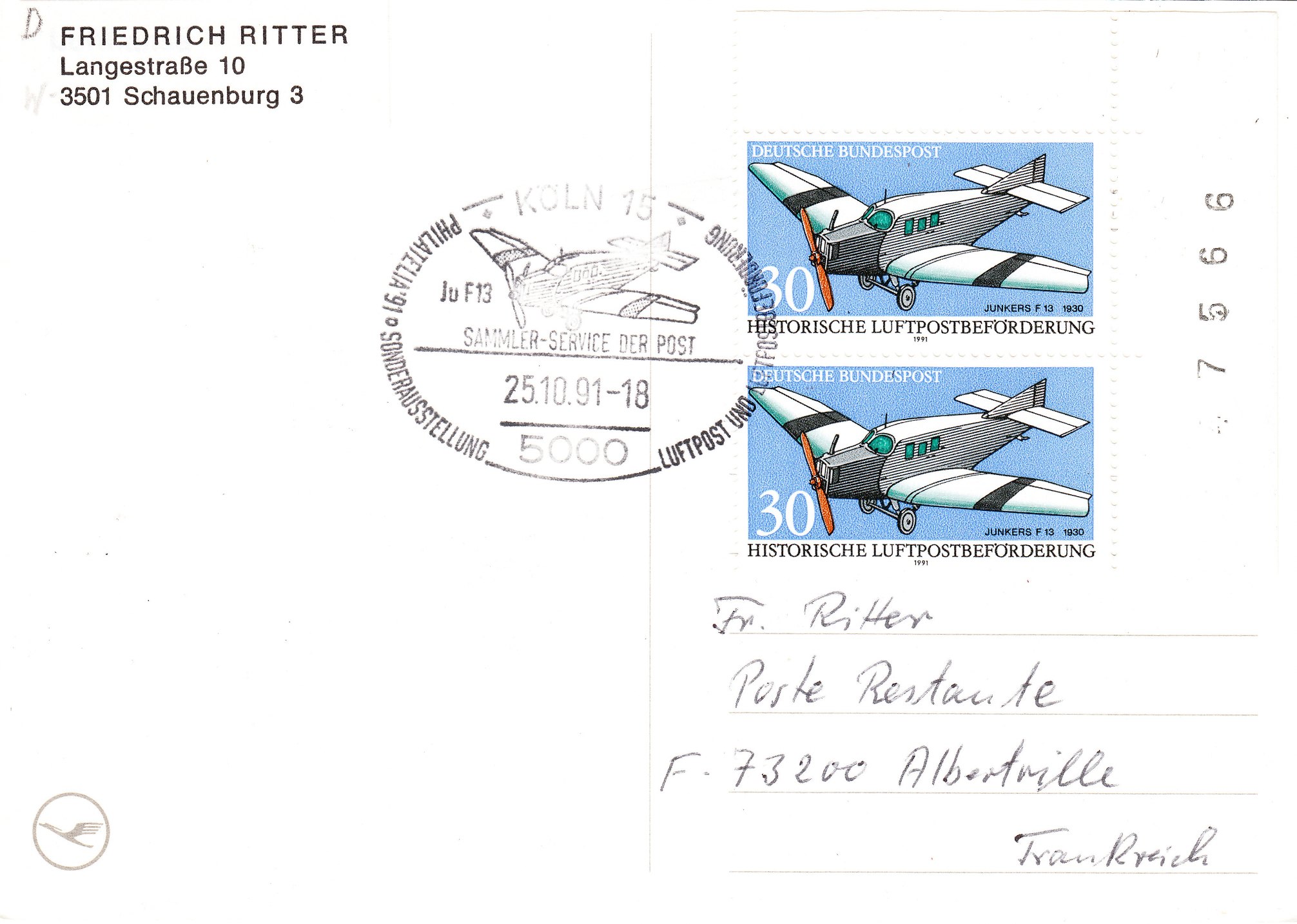Als Bund MiNr. 1522 erschien diese Sondermarke mit dem Motiv JUNKERS F 13, hier als senkrechtes Paar vom rechten Bogenrand mit Bogenzählnummer "47566", entwertet am 25.10.1991 mit passendem Handwerbestempel in Köln: