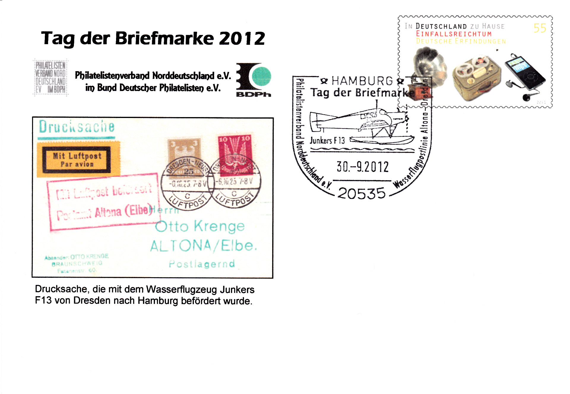 Di8e Junkers F13 wurde in einigen Exemplaren auch als Wasserflugzeug gebaut. In diesem Sonderstempel zum Tag der Briefmarke 2012 aus Hamburg vom 30.9.2012 wird ein Wasserflugzeug Junkers F13 gezeigt. Der Zudruck auf diesem Plusbrief (MiNr USo 250) mit dem Wertstempel "Einfallsreichtum Deutsche Erfindungen" (MiNr 2892) zeigt einen Brief der mit diesem Wasserflugzeug befördert wurde.
