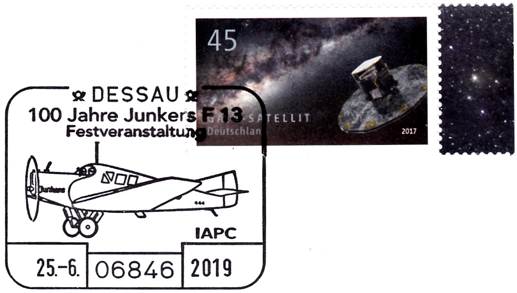 Sonderstempel aus Dessau vom 25.6.2019 zur Festveranstaltung "100 Jahre Junkers F 13" mit einer Junkers F 13 im Stempelbild.
