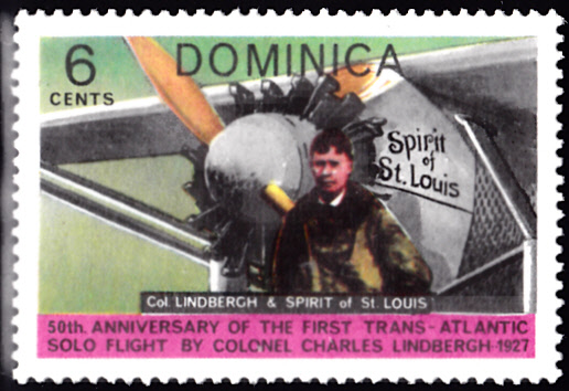 Auf Dominica ist zum 50. Jahrestag des 1. Transatlantikfluges von Charles Lindbergh diese Marke (MiNr 568) mit einer Abbildung von Charles Lindbergh und der "Spirit of St. Louis" erschienen.