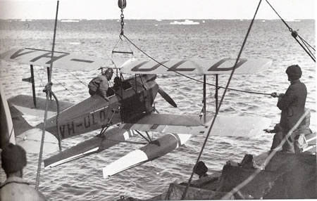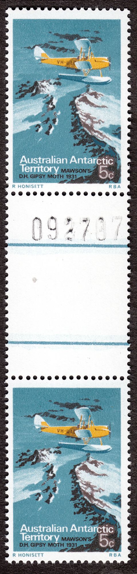 Diese Marke zu 5 Cents zeigt einen Doppeldecker DE HAVILLAND DH60G als in der Antarktis von Sir Douglas Mawson "MAWSON'S D.H. GIPSY MOTH 1931" mit der Kennung "VH-ULD" benutzte Maschine: