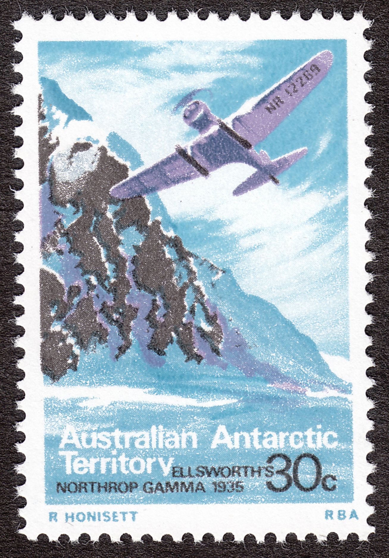 Diese Marke der australischen Antarktisgebiete zeigt die berühmte NORTHROP GAMMA "POLAR STAR" von Lincoln Ellsworth: