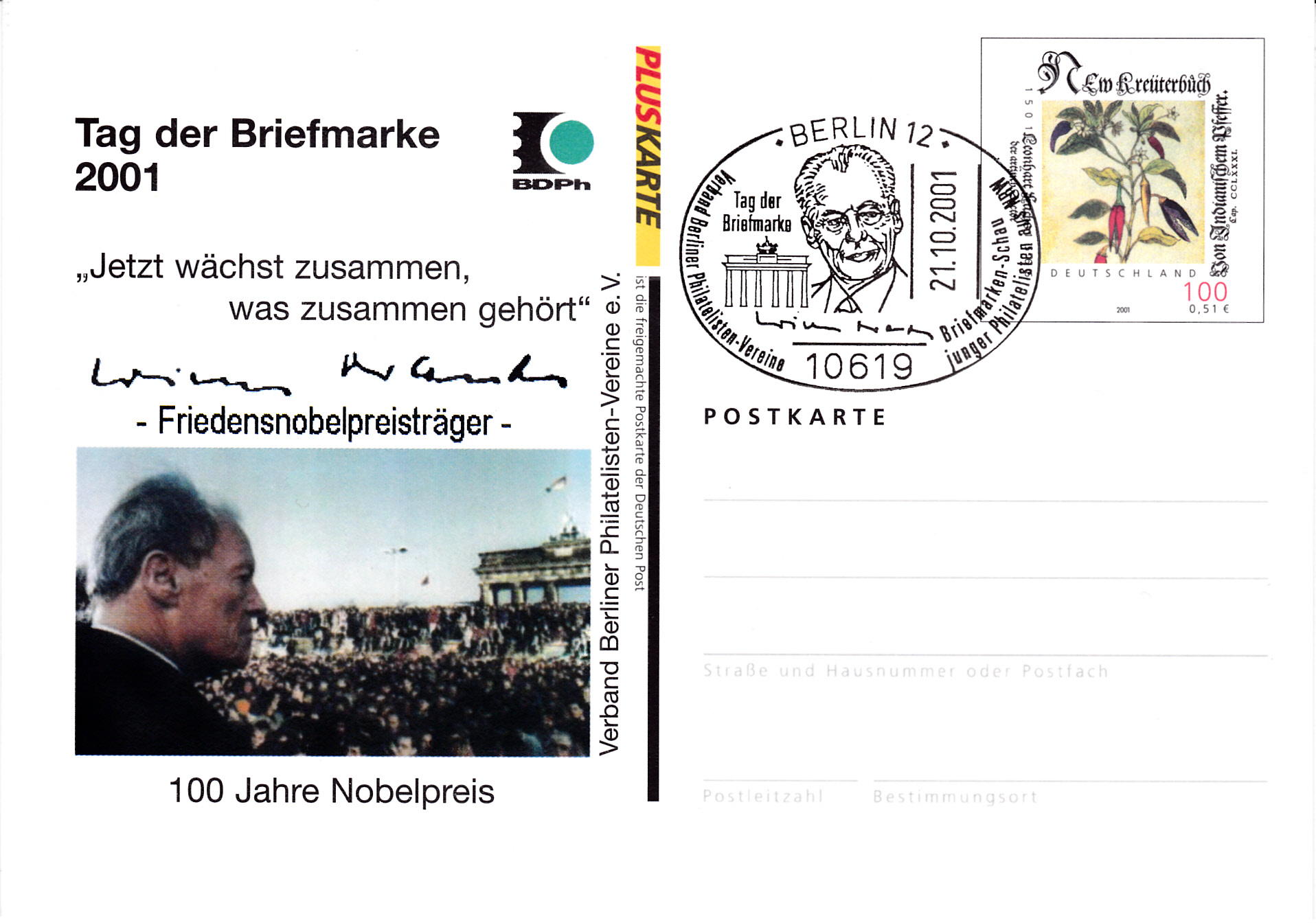Pluskarte (MiNr PSo 77 II) mit einem Zudruck zum Tag der Briefmarke 2001 des Verbandes Berliner Philatelisten-Vereine e.V. und dem dazu passenden Sonderstempel vom 21.10.2001 aus Berlin.