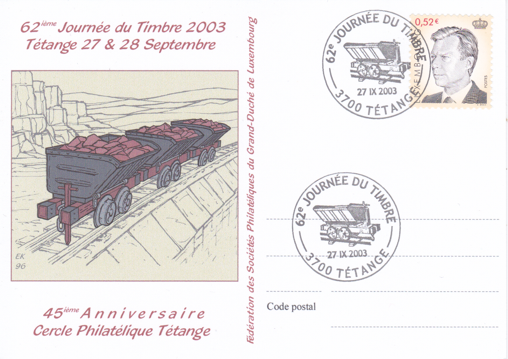 Zum Tag der Briefmarke 2003 war in Tétange am 27. September 2003 ein Sonderstempel im Einsatz. Hier zeige ich eine leider nicht gelaufene Postkarte mit diesem Stempel.