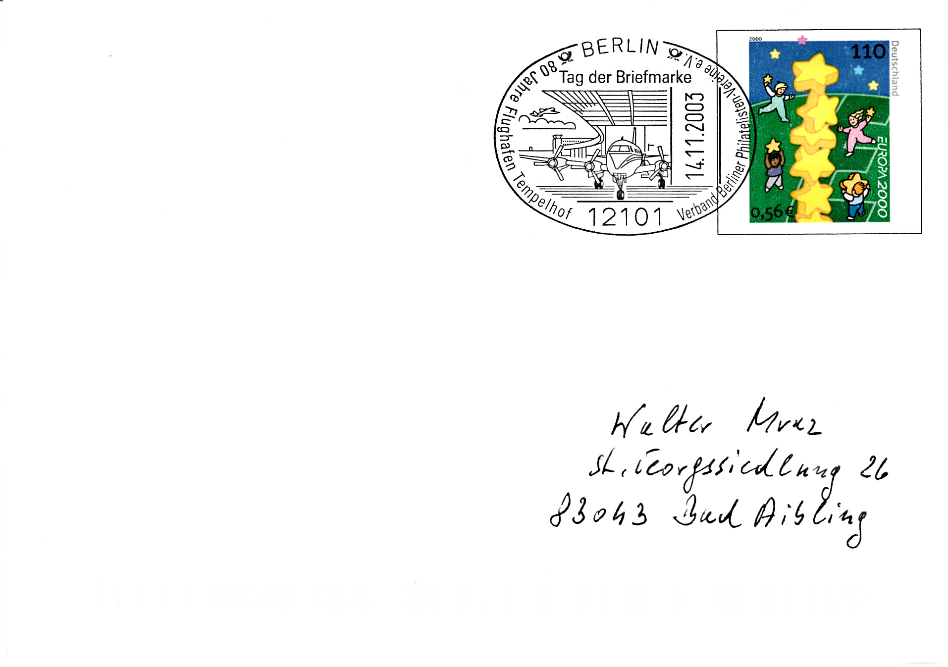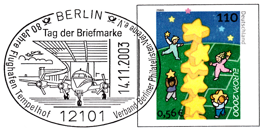 Sonderstempel aus Berlin vom 14.11.2003 zum Tag der Briefmarke 2003 mit einer Abbildung zum Jubiläum "80 Jahre Flughafen Tempelhof" auf einem Plusbrief (MiNr USo 19) mit dem Wertstempel Europa 2000.
