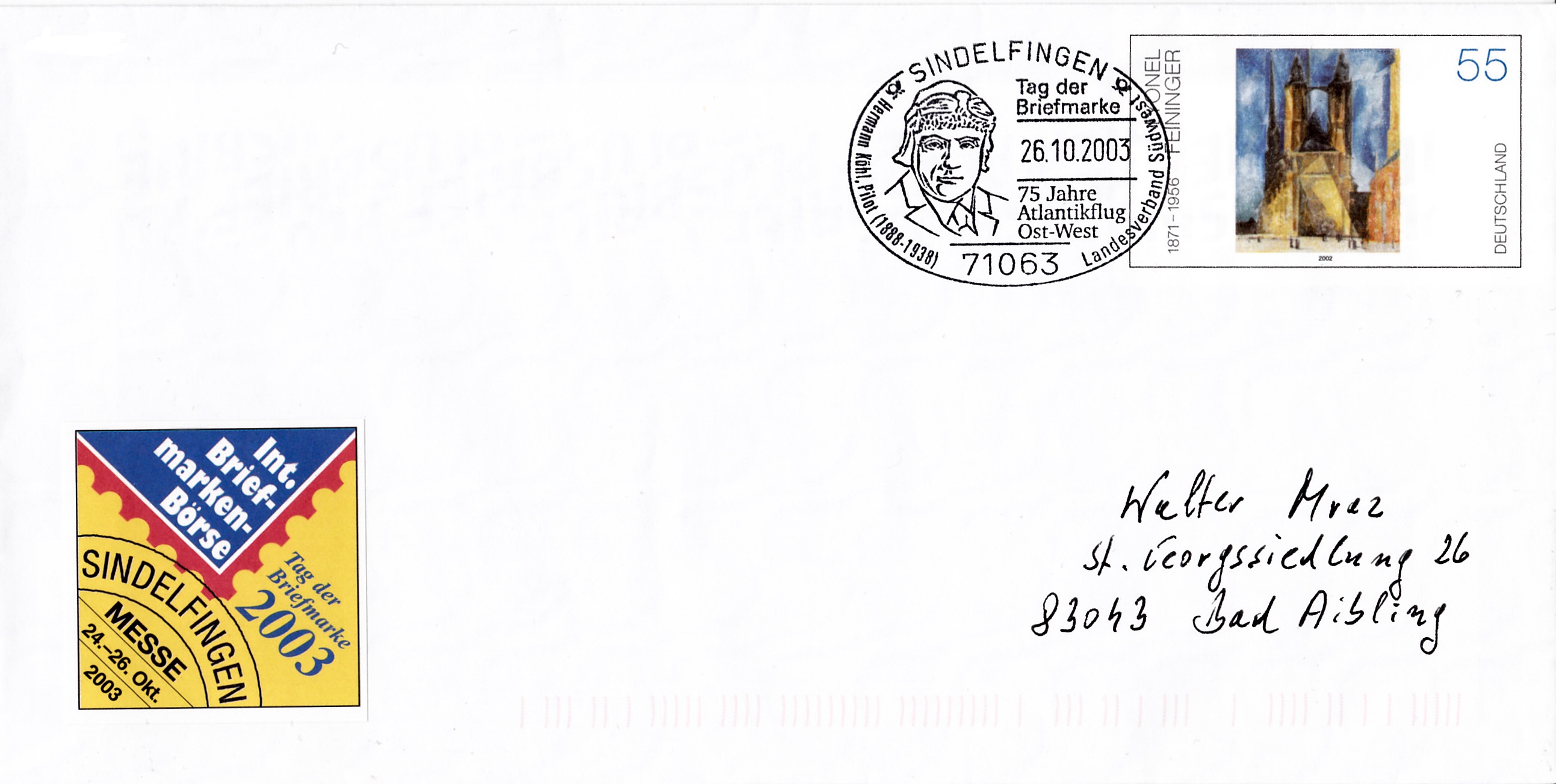 Sonderstempel aus Sindelfingen vom 26.10.2003 zum Tag der Briefmarke 2003 mit einer Abbildung des Piloten Hermann Köhl (geb. 15. April 1888 in Neu-Ulm; gest. 7. Okt. 1938 in München; deutscher Flugpionier) auf einem Plusbrief (MiNr USo 46 A/01) mit dem Wertstempel Lyonel Feininger. Hermann Köhl war 1928 Pilot der Junkers W 33 "Bremen" bei der ersten erfolgreichen Überquerung des Atlantiks in Ost-West-Richtung durch ein Motorflugzeug.