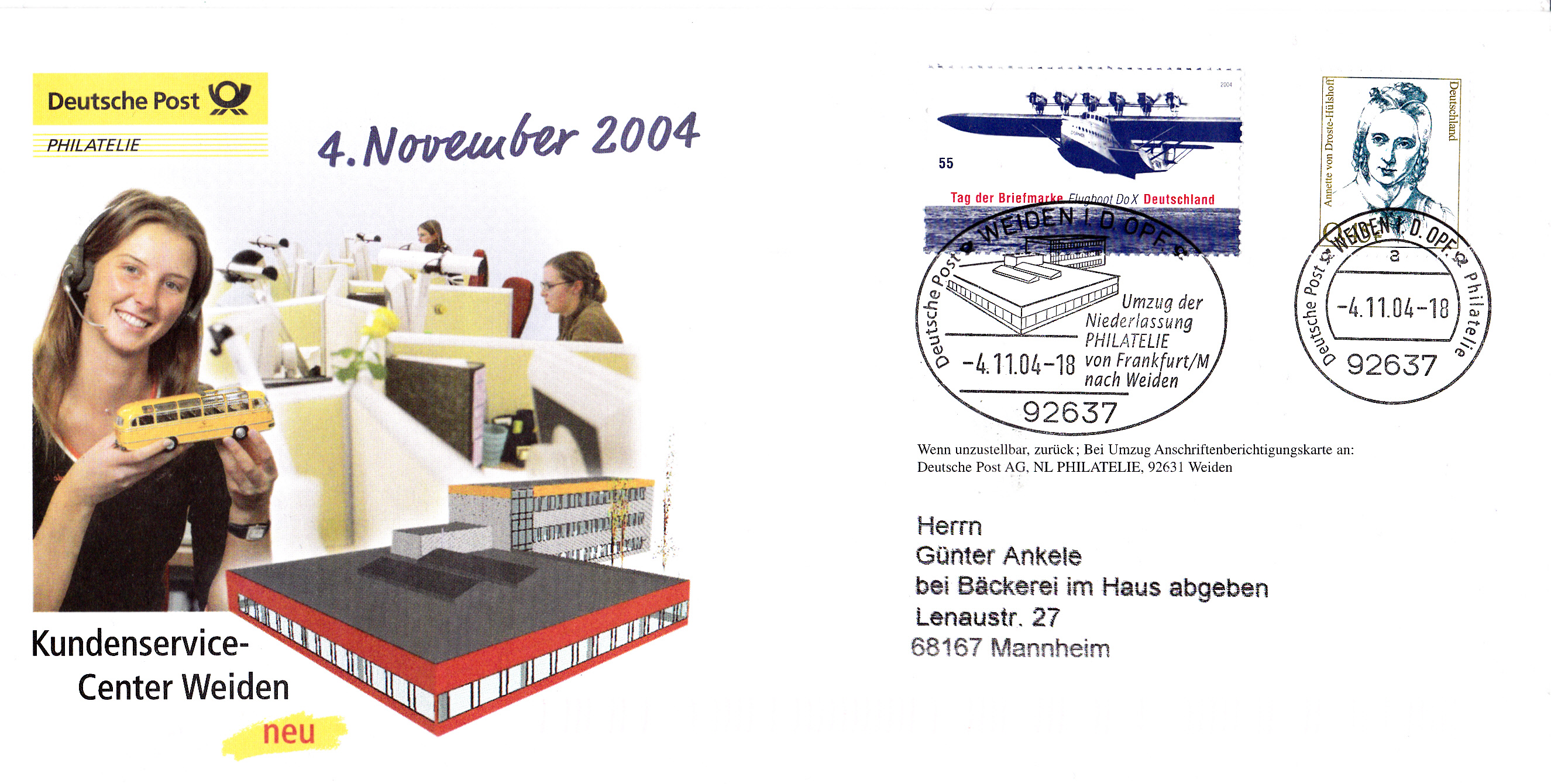 Hier hat die NL Philatelie die Marke zum Tag der Briefmarke zusammen mit der 0,45€ Marke aus der DS Frauen zur Frankatur eines Briefes an die Sammler benutzt, um den Umzug von Frankfurt nach Weiden mitzuteilen.